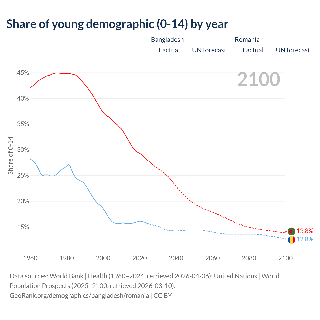 - The share of young demographic (0-15 years old) in Bangladesh is 28% vs 15.7% in Romania.
