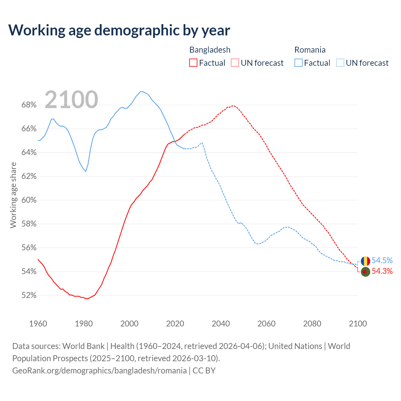 Median age Bangladesh vs Romania, 1960-2100