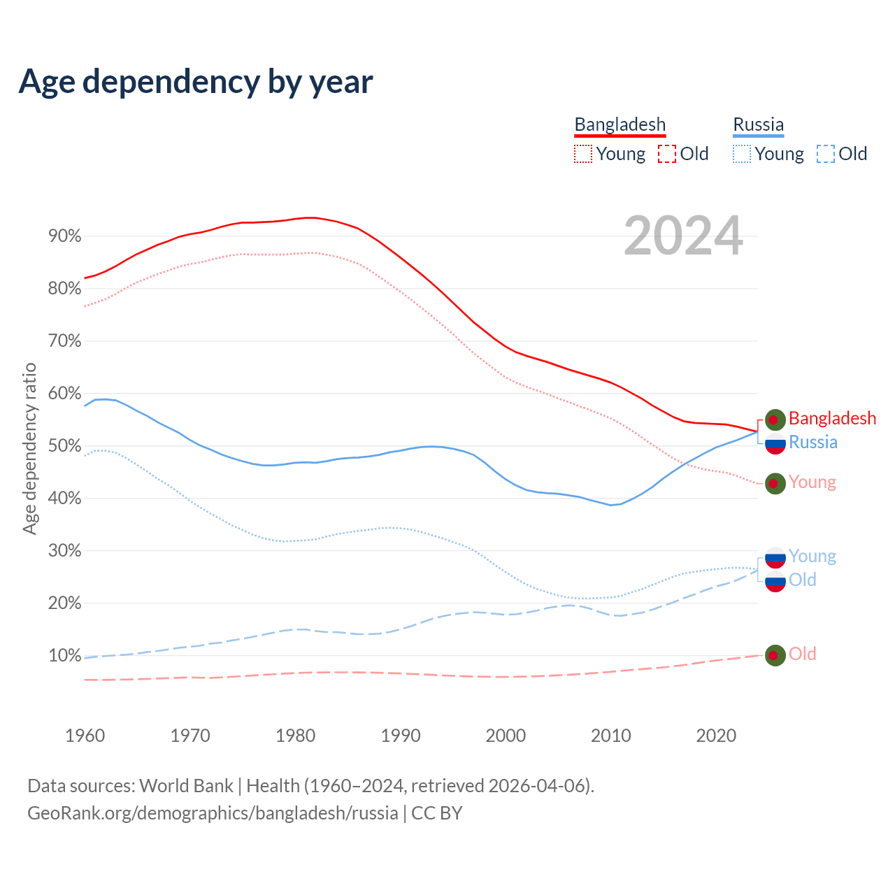 - Bangladesh is ranked 124/196 by median age (oldest to youngest) vs 42/196 for Russia.