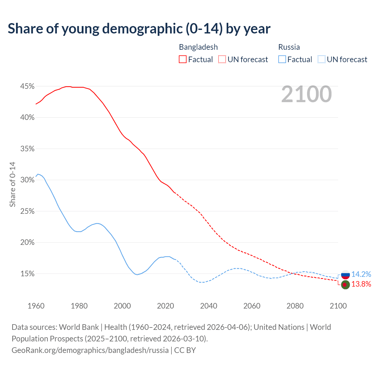 - As of 2026, the population of Bangladesh is 178M vs 142M in Russia - 1.26 times difference.