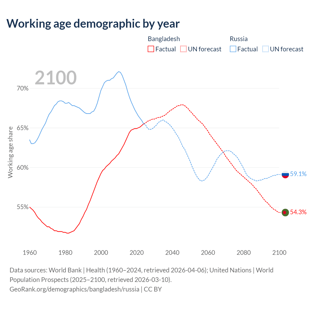 - Bangladesh has 117M working age adults (aged 15-64) vs 93M in Russia.