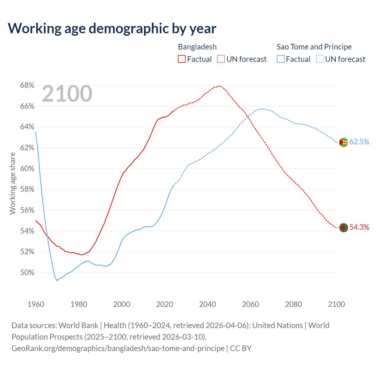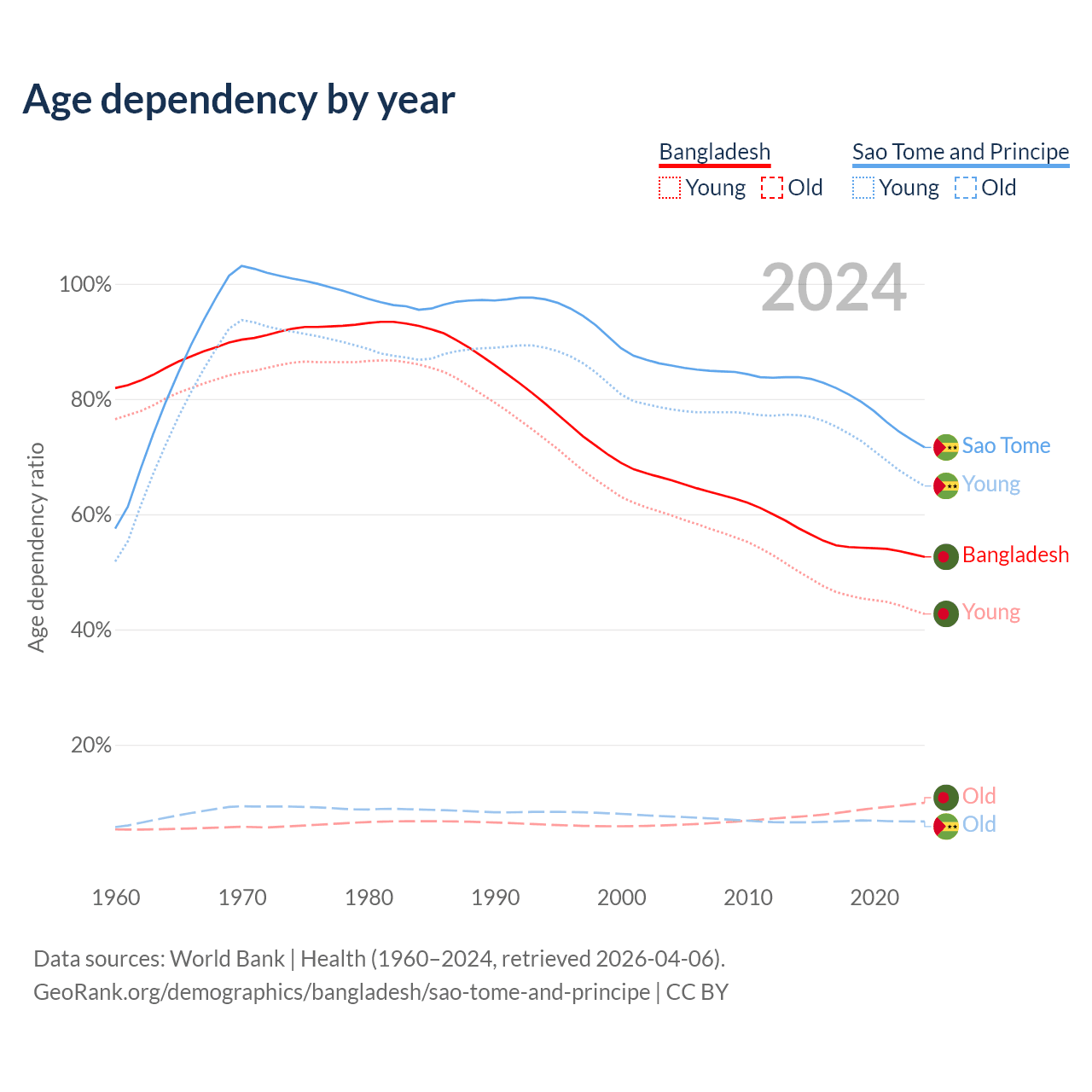 - Bangladesh is ranked 124/196 by median age (oldest to youngest) vs 163/196 for Sao Tome and Principe.