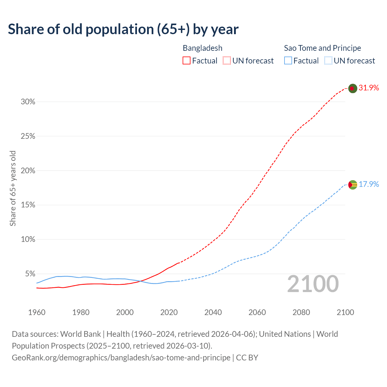 The share of older people aged 65 and over is 6.5% in Bangladesh and 3.9% in Sao Tome and Principe. Life expectancy in Bangladesh compared to Sao Tome and Principe .