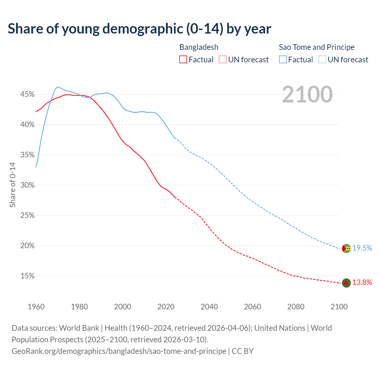 - The share of young demographic (0-15 years old) in Bangladesh is 28% vs 37.8% in Sao Tome and Principe.