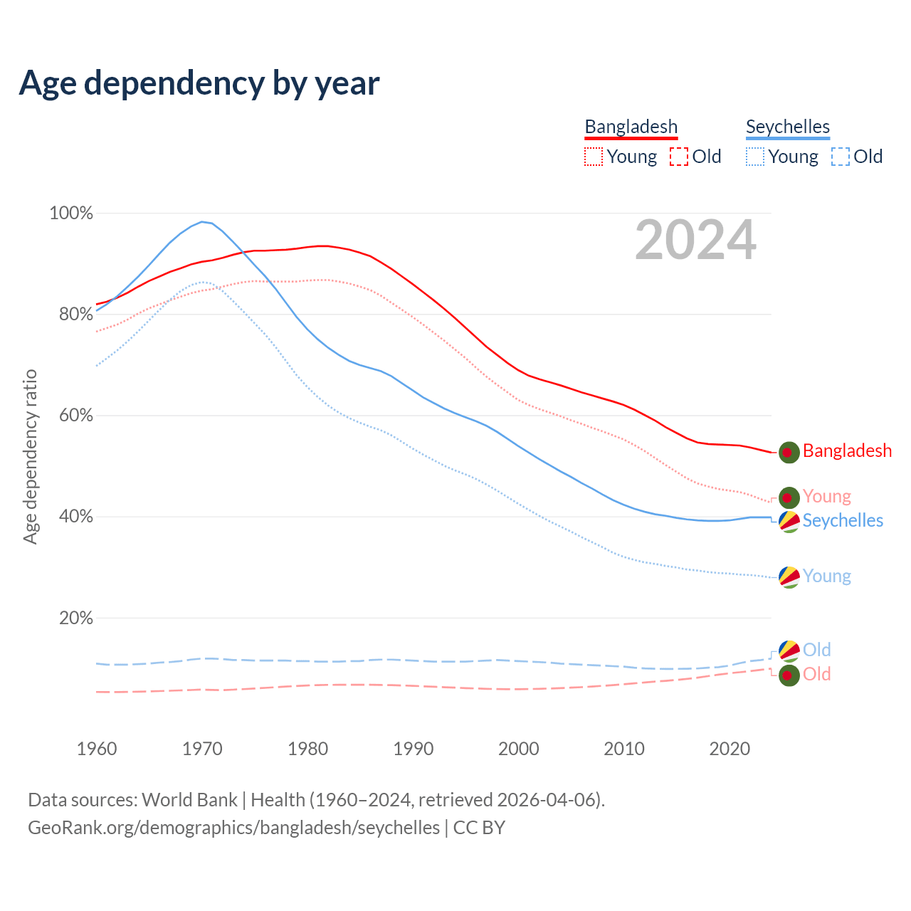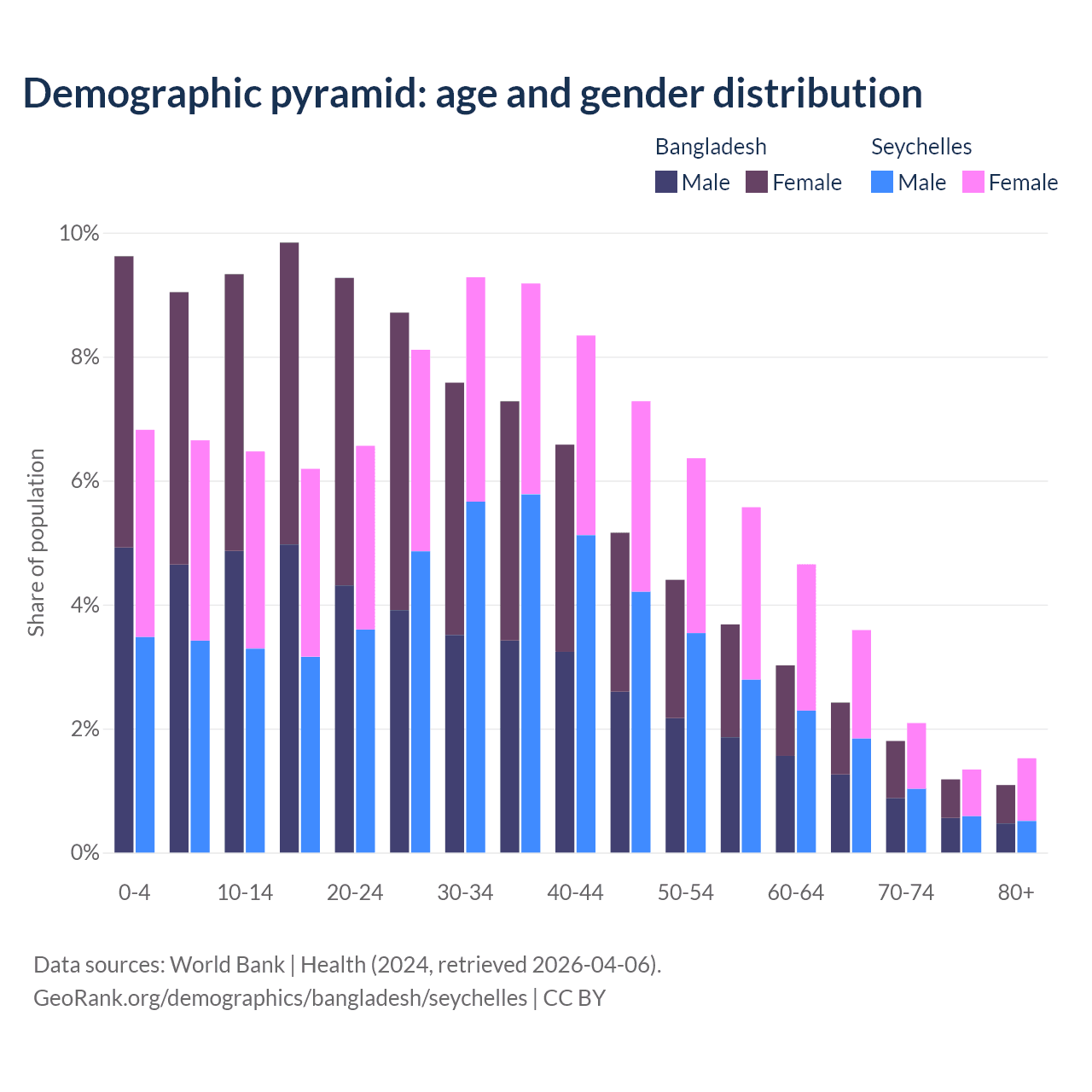 - Bangladesh is ranked 124/196 by median age (oldest to youngest) vs 76/196 for the Seychelles.