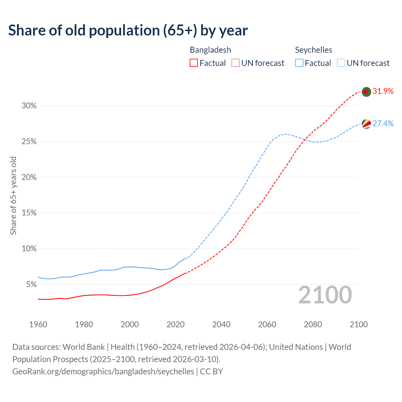 The share of older people aged 65 and over is 6.5% in Bangladesh and 8.54% in the Seychelles. Life expectancy in Bangladesh compared to the Seychelles .