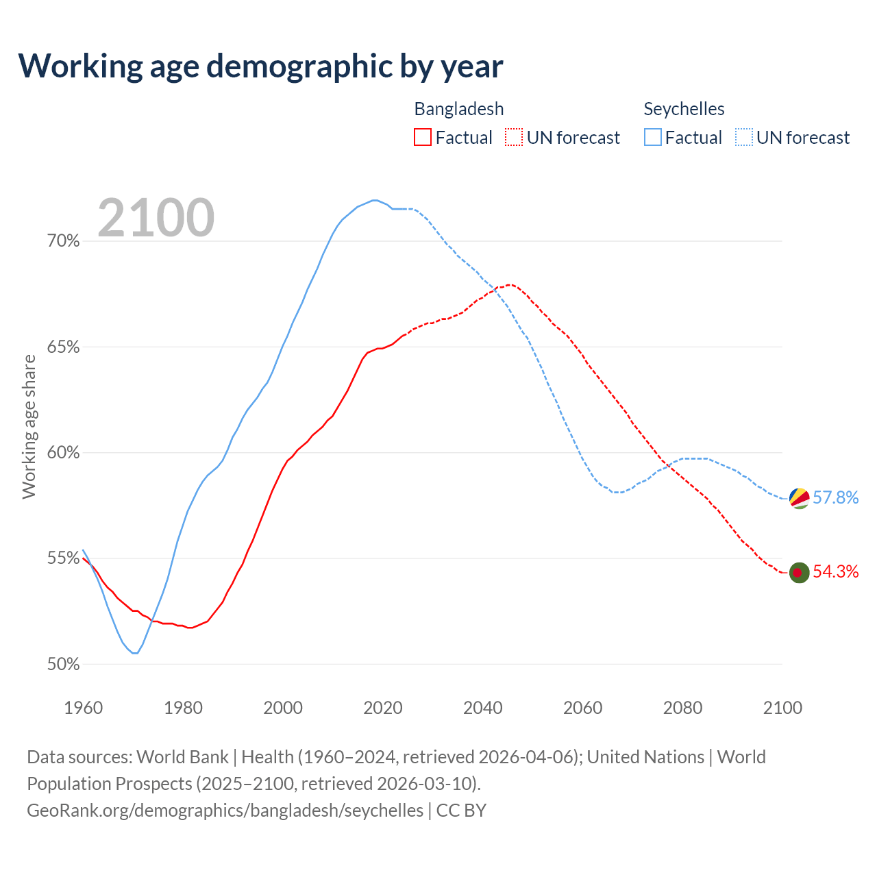 Median age Bangladesh vs Seychelles, 1960-2100