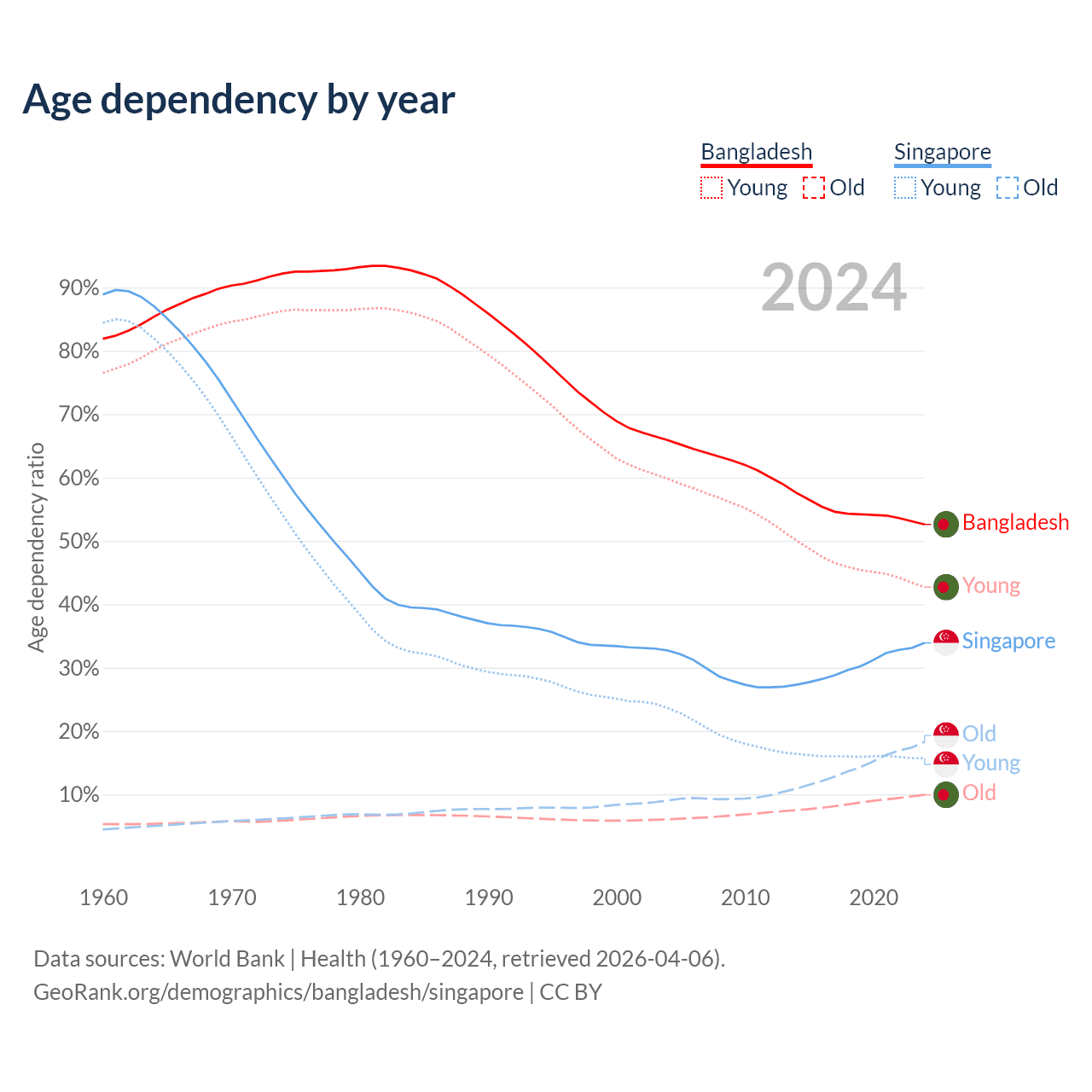 - Bangladesh is ranked 124/196 by median age (oldest to youngest) vs 68/196 for Singapore.