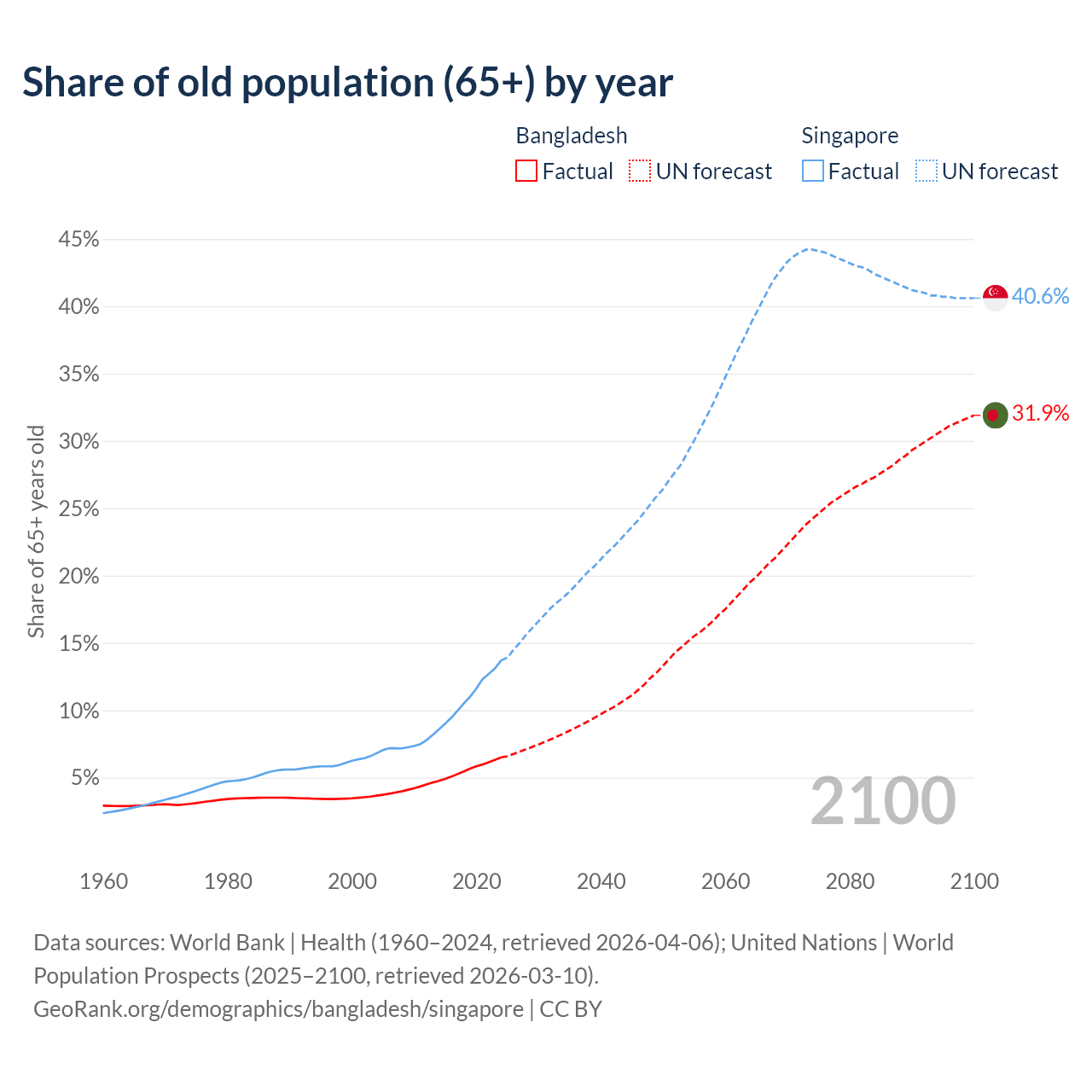 The share of older people aged 65 and over is 6.5% in Bangladesh and 13.7% in Singapore. Life expectancy in Bangladesh compared to Singapore .