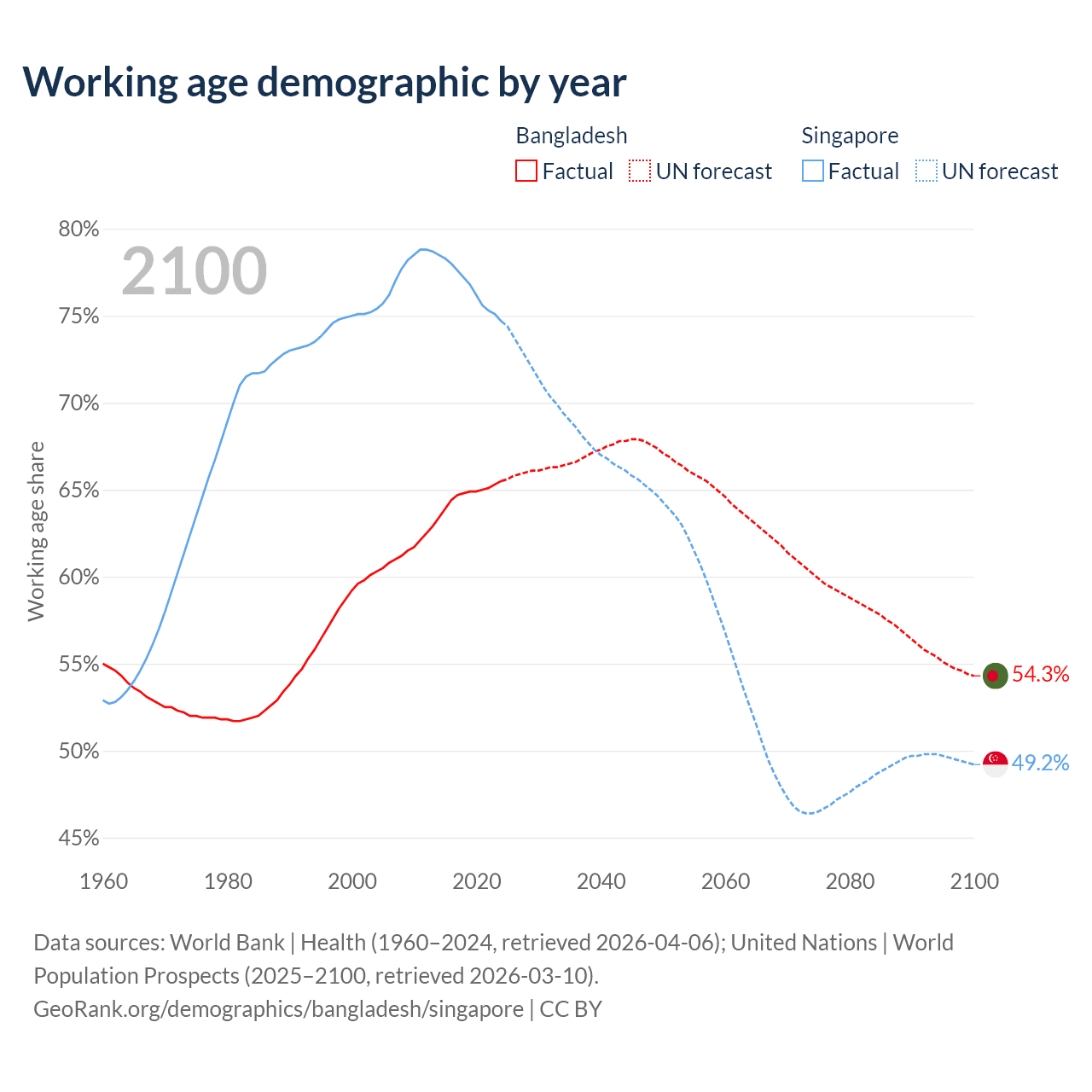 Median age Bangladesh vs Singapore, 1960-2100