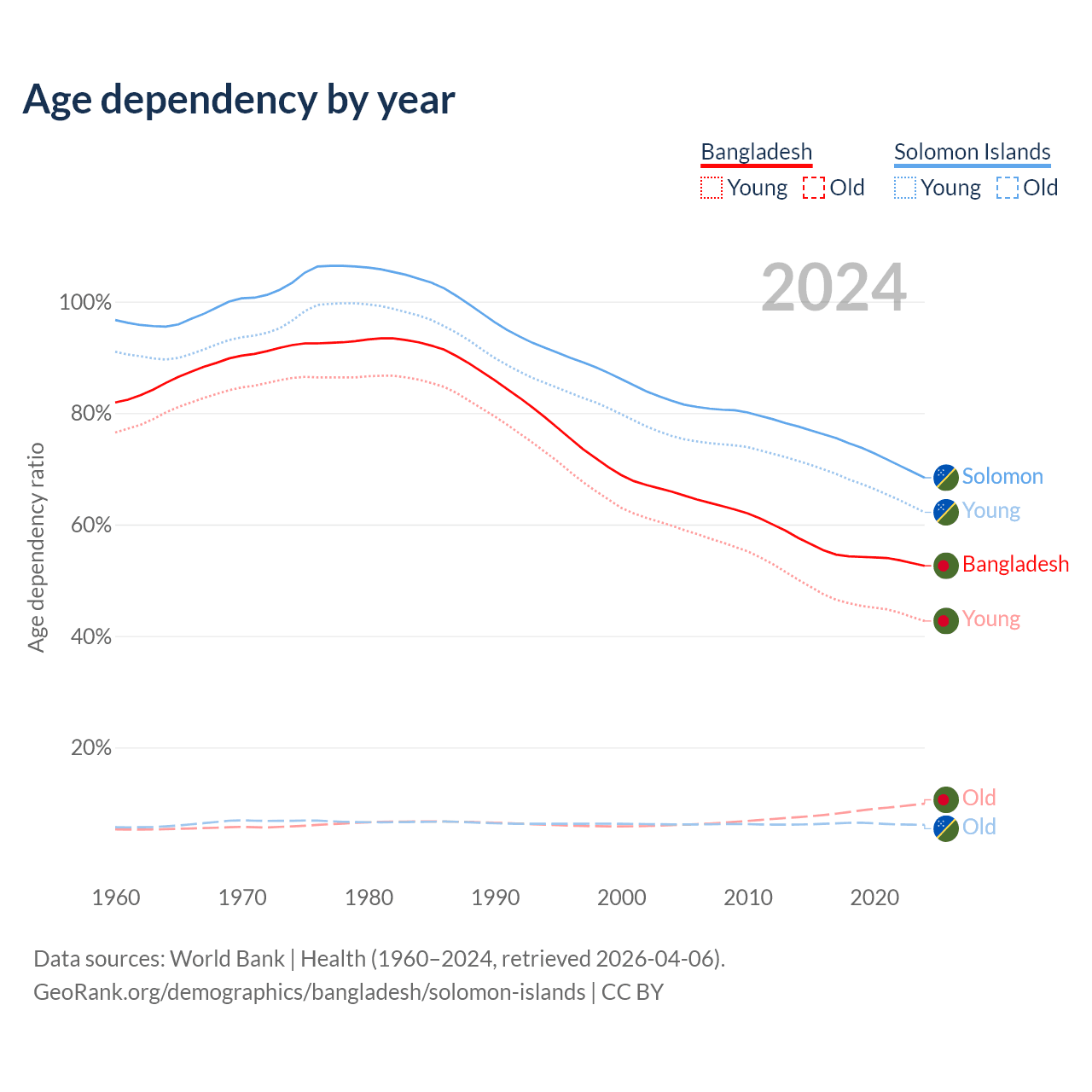 - Bangladesh is ranked 124/196 by median age (oldest to youngest) vs 153/196 for the Solomon Islands.