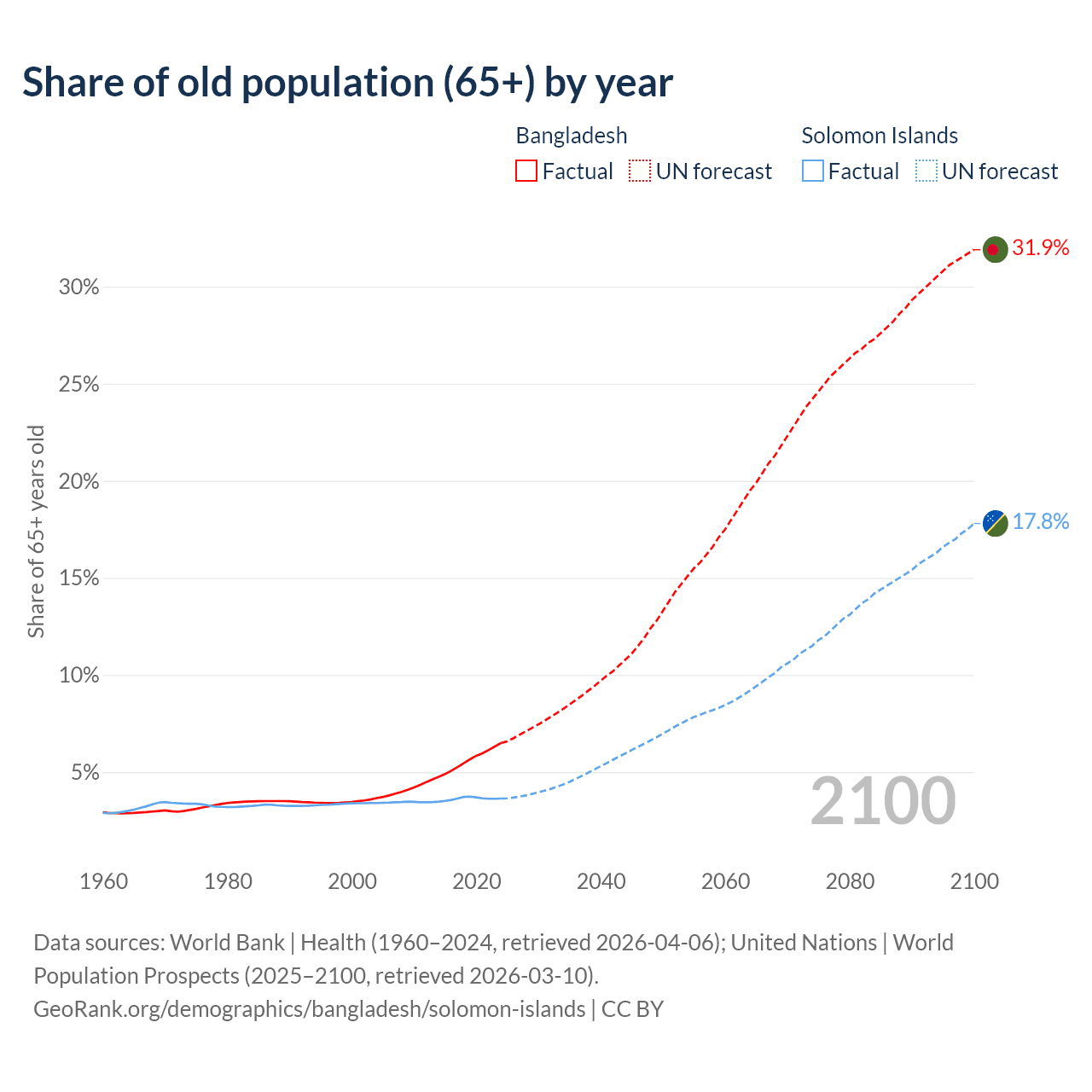 The share of older people aged 65 and over is 6.5% in Bangladesh and 3.64% in the Solomon Islands. Life expectancy in Bangladesh compared to the Solomon Islands .