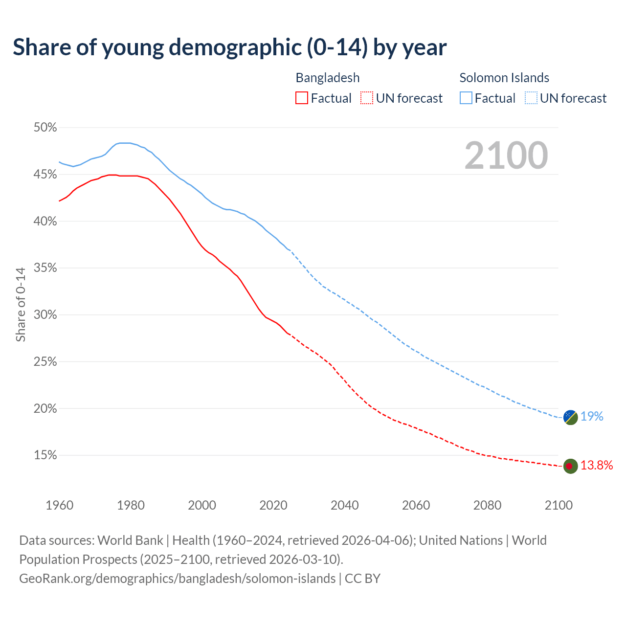 - The share of young demographic (0-15 years old) in Bangladesh is 28% vs 37% in the Solomon Islands.