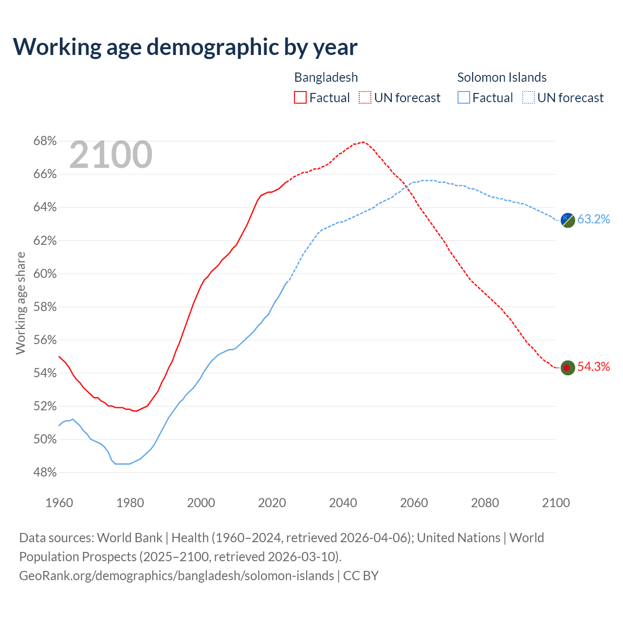 - Bangladesh has 117M working age adults (aged 15-64) vs 513K in the Solomon Islands.