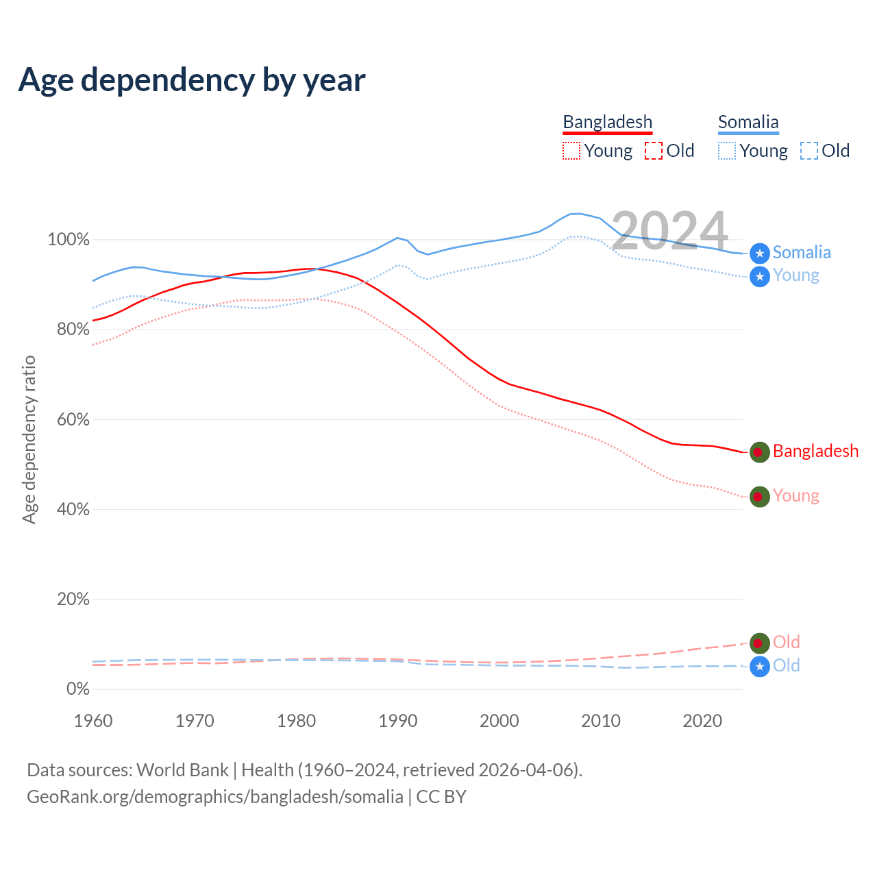 - Bangladesh is ranked 124/196 by median age (oldest to youngest) vs 194/196 for Somalia.