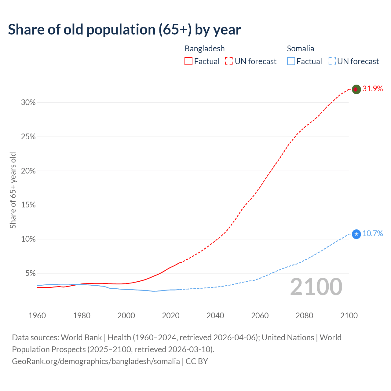 - The share of old-age demographic (65+) in Bangladesh is 6.5% vs 2.59% in Somalia.