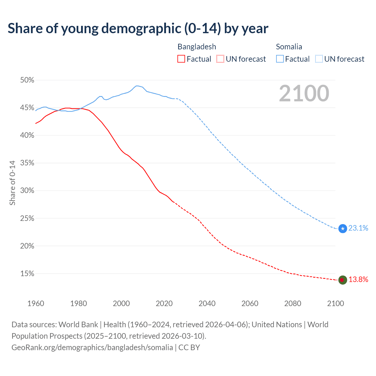 - The share of young demographic (0-15 years old) in Bangladesh is 28% vs 46.6% in Somalia.