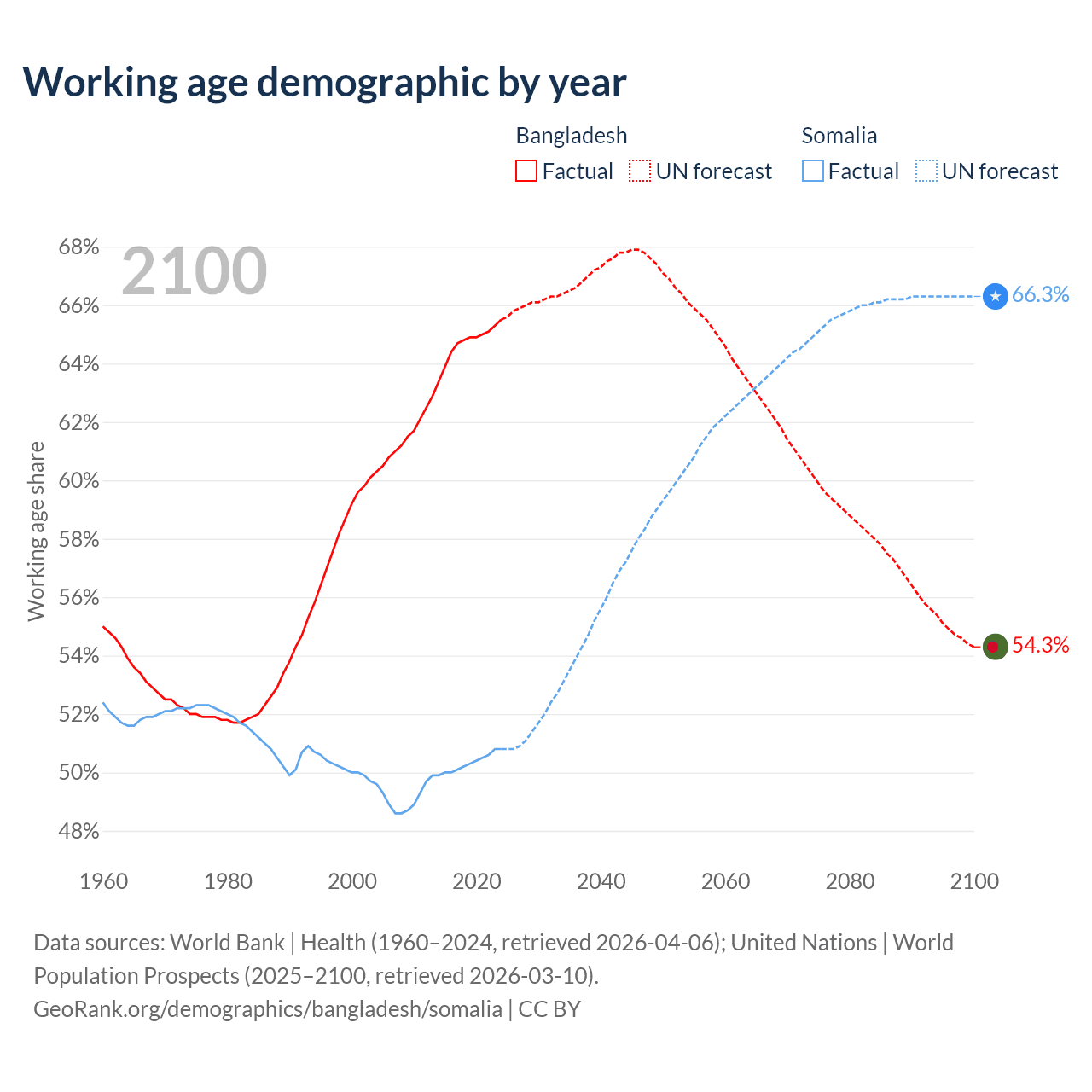 Median age Bangladesh vs Somalia, 1960-2100