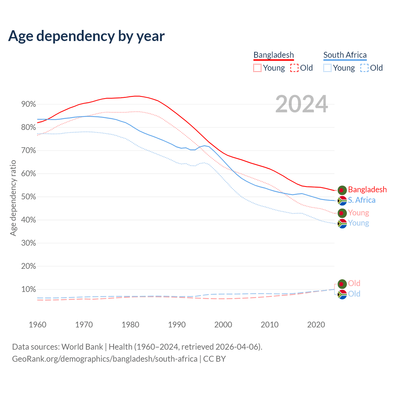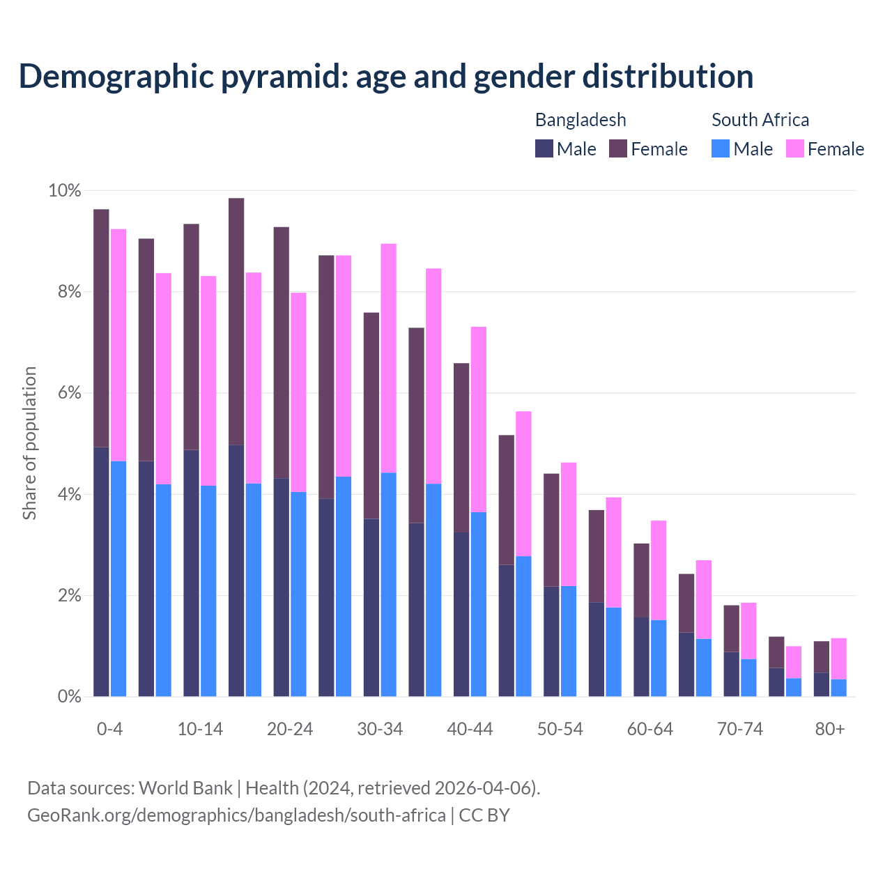 - Bangladesh is ranked 124/196 by median age (oldest to youngest) vs 107/196 for South Africa.