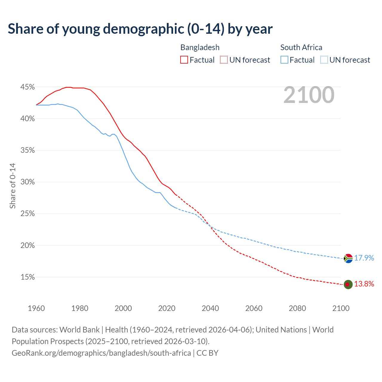 - The share of young demographic (0-15 years old) in Bangladesh is 28% vs 25.9% in South Africa.