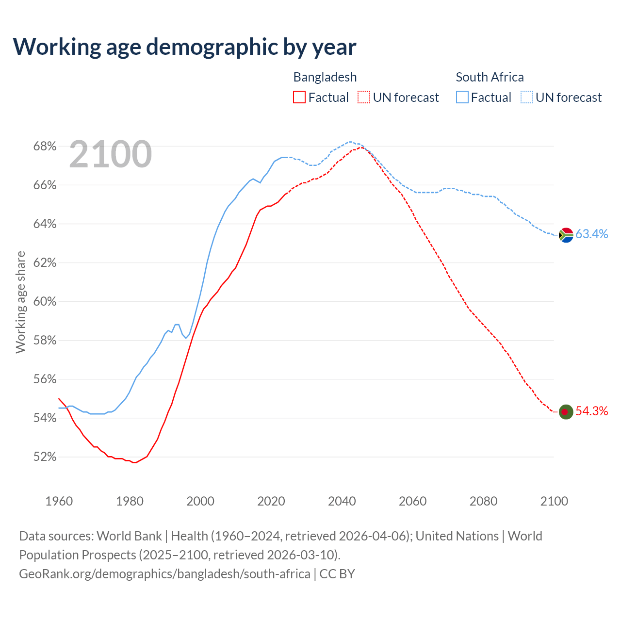 - Bangladesh has 117M working age adults (aged 15-64) vs 44.3M in South Africa.