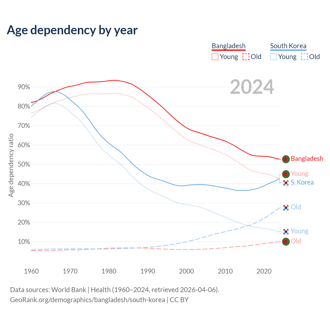 - Bangladesh is ranked 124/196 by median age (oldest to youngest) vs 10/196 for South Korea.