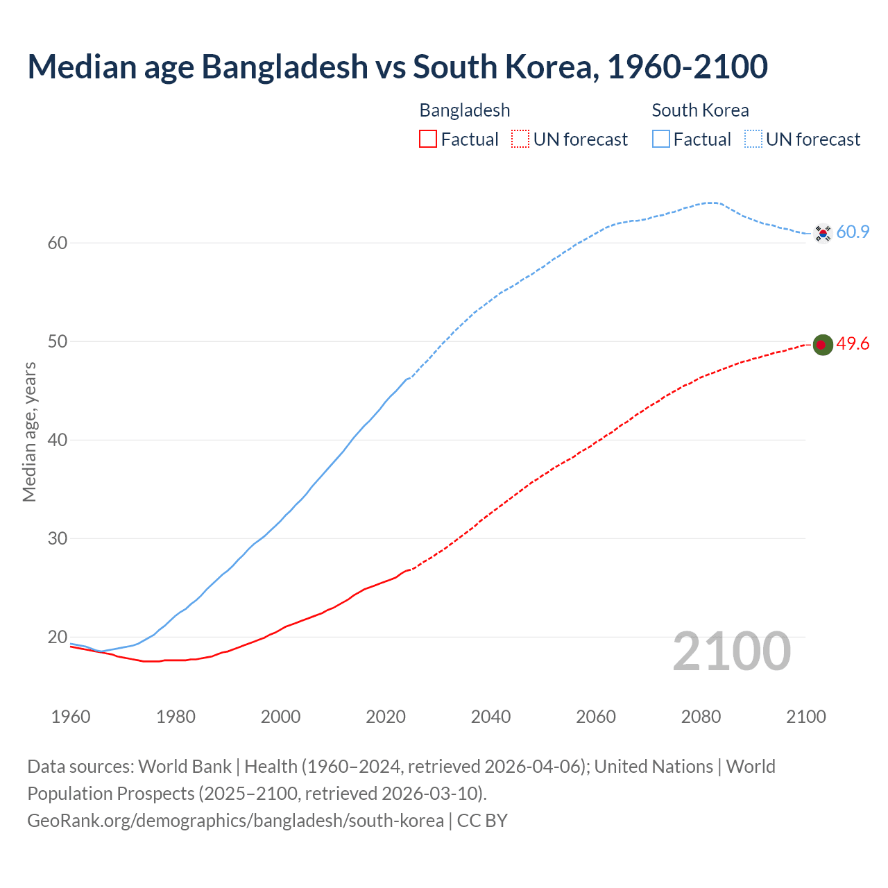 - The median age in Bangladesh is 26.7 years compared to 46.1 years in South Korea.
