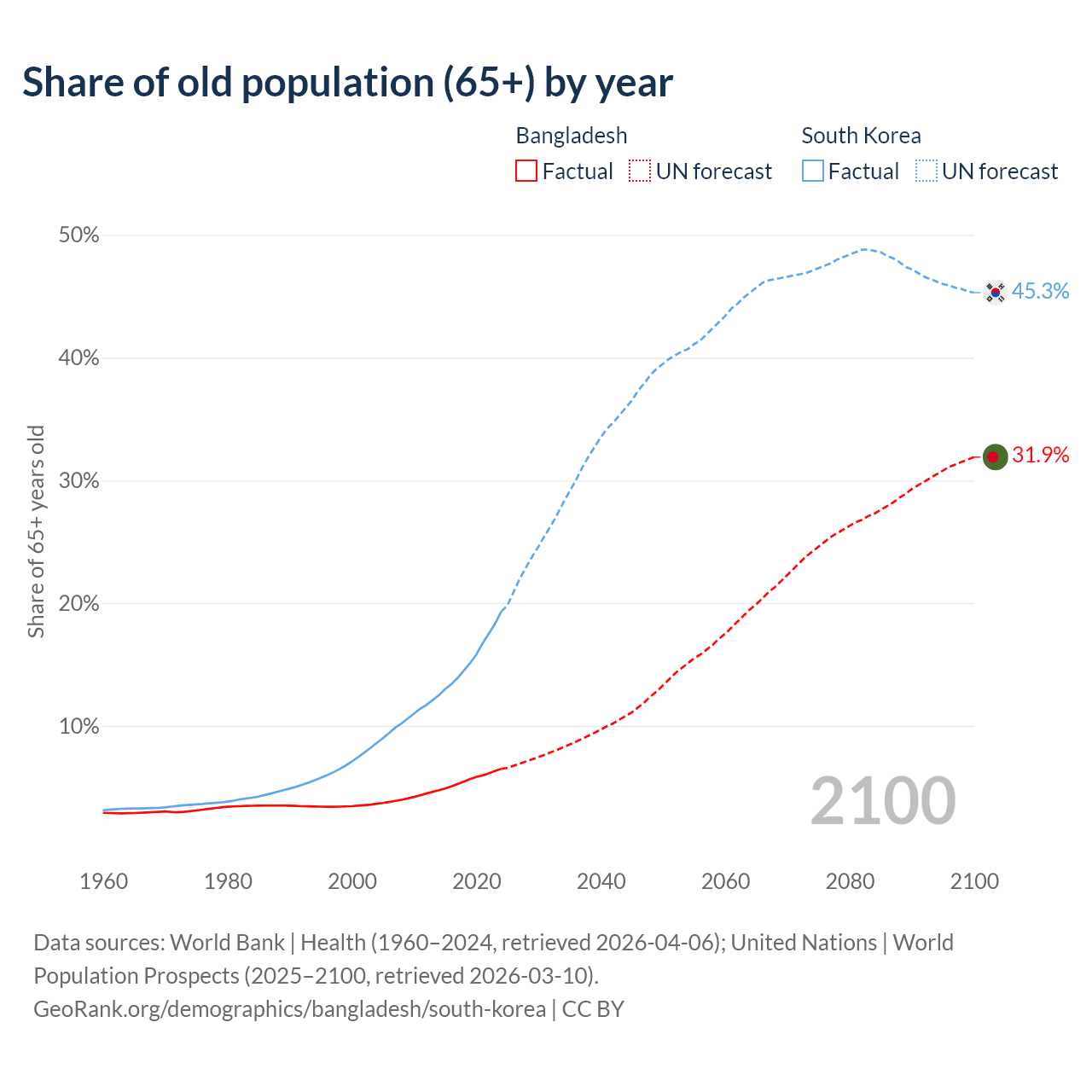 The share of older people aged 65 and over is 6.5% in Bangladesh and 19.3% in South Korea. Life expectancy in Bangladesh compared to South Korea .