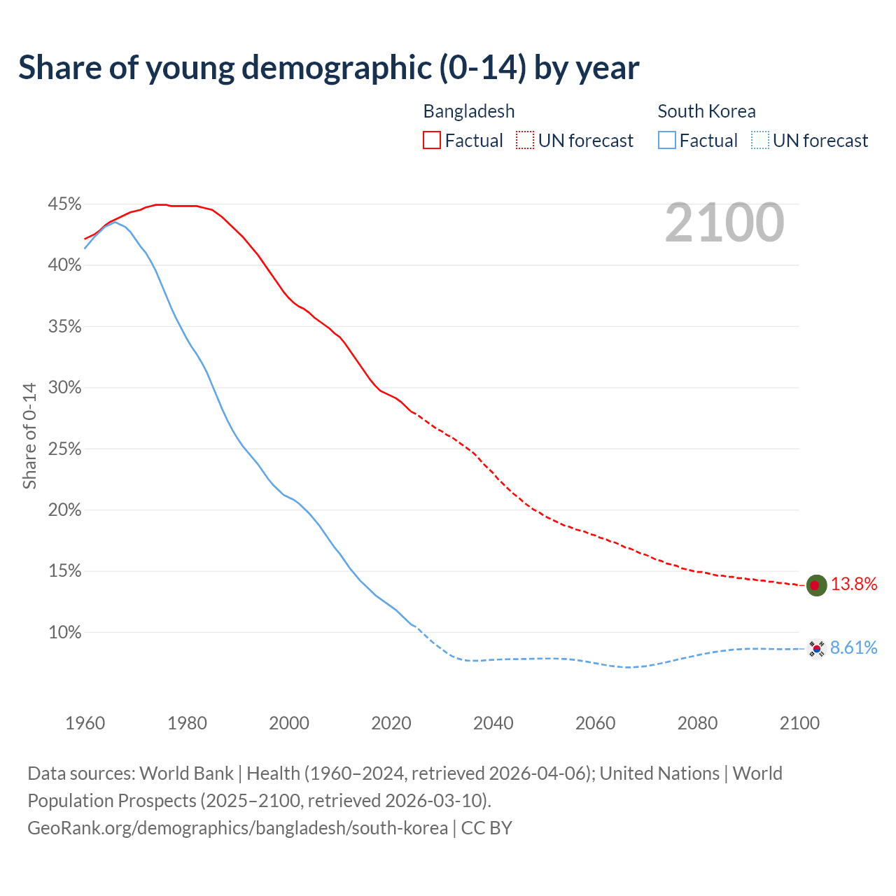 - The share of young demographic (0-15 years old) in Bangladesh is 28% vs 10.6% in South Korea.
