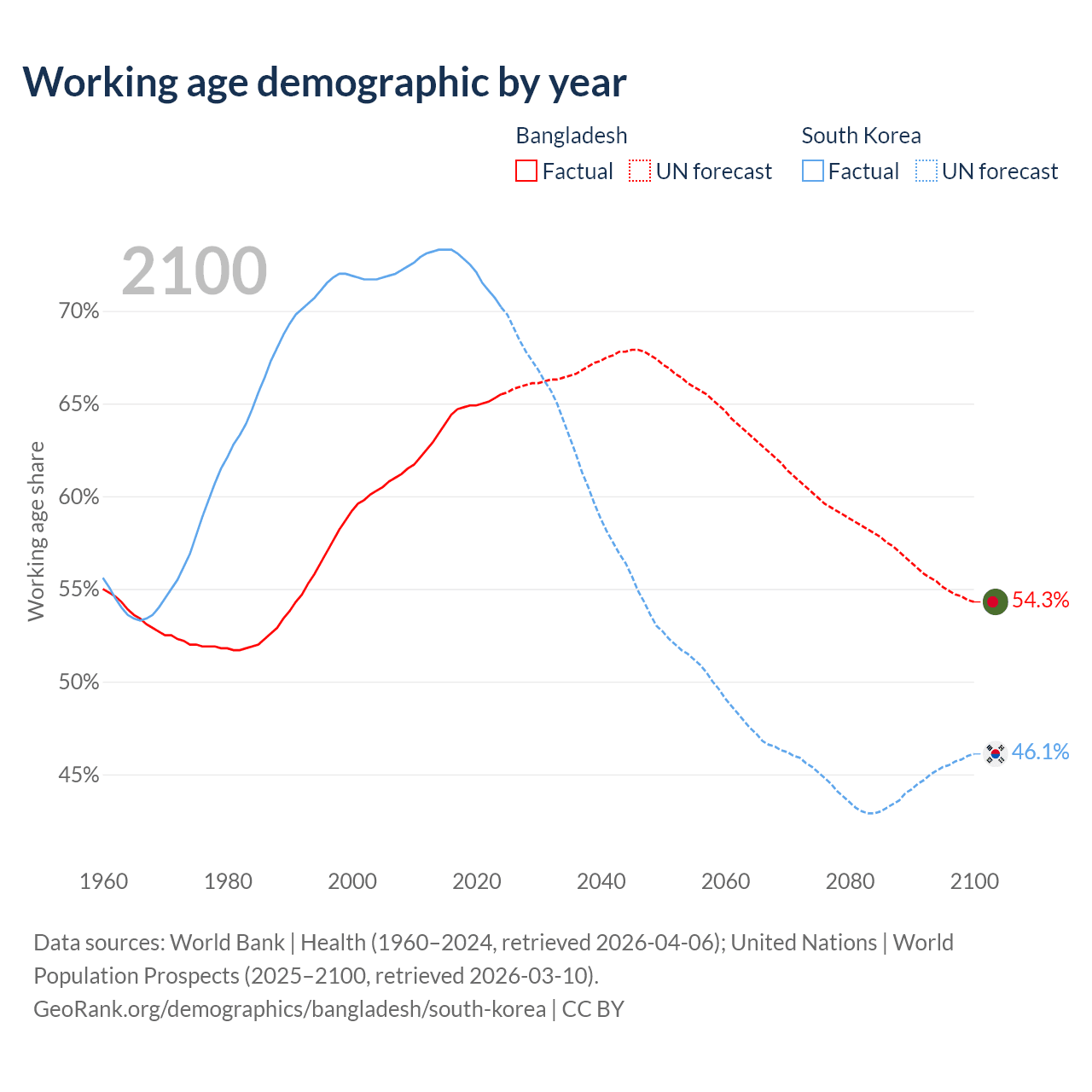 - Bangladesh has 117M working age adults (aged 15-64) vs 36.2M in South Korea.