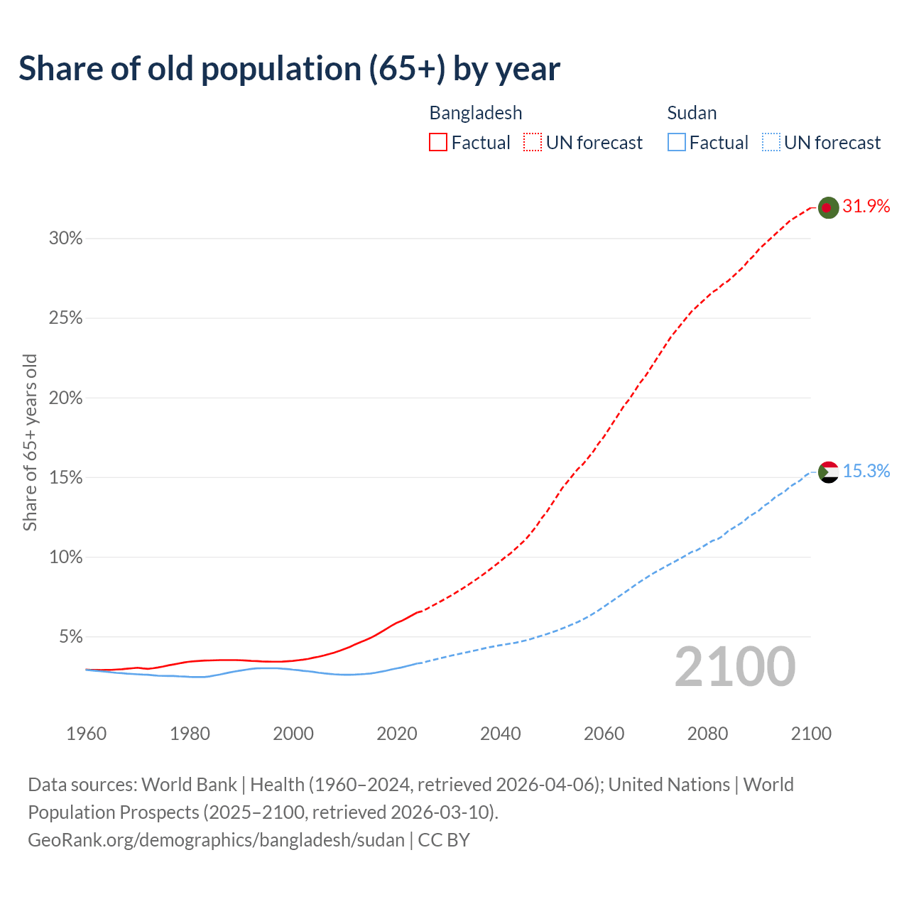 The share of older people aged 65 and over is 6.5% in Bangladesh and 3.3% in Sudan. Life expectancy in Bangladesh compared to Sudan .