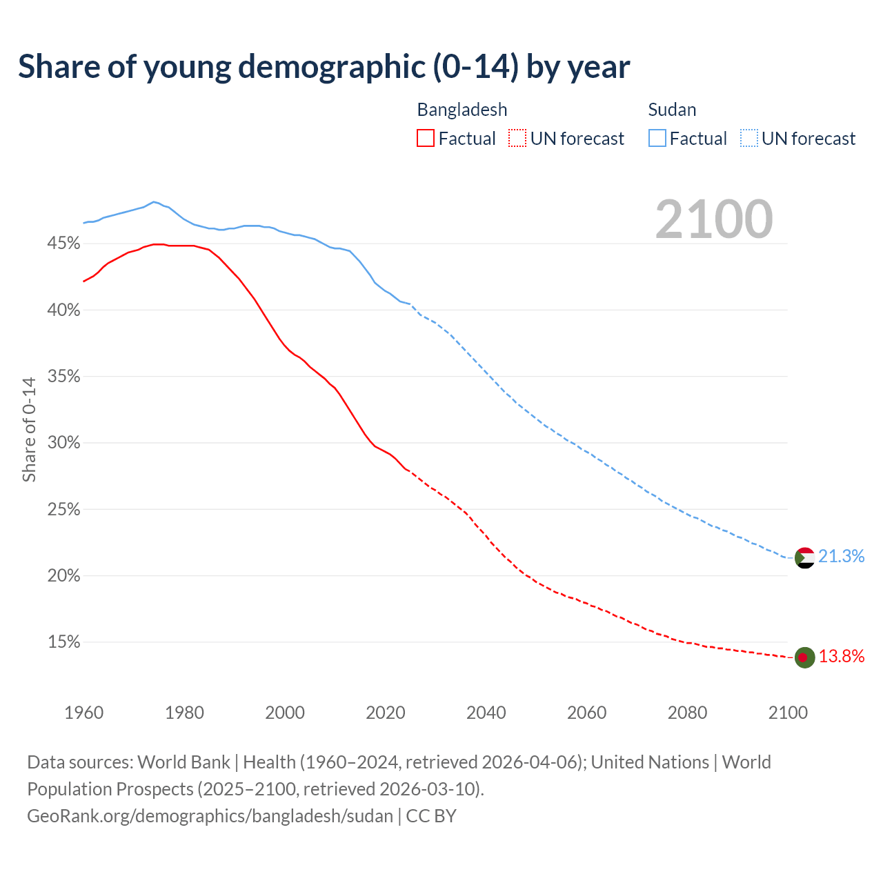- The share of young demographic (0-15 years old) in Bangladesh is 28% vs 40.5% in Sudan.