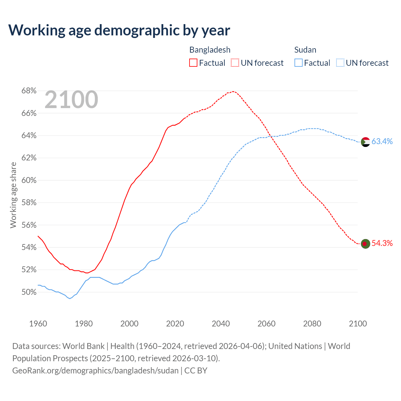 - Bangladesh has 117M working age adults (aged 15-64) vs 30M in Sudan.