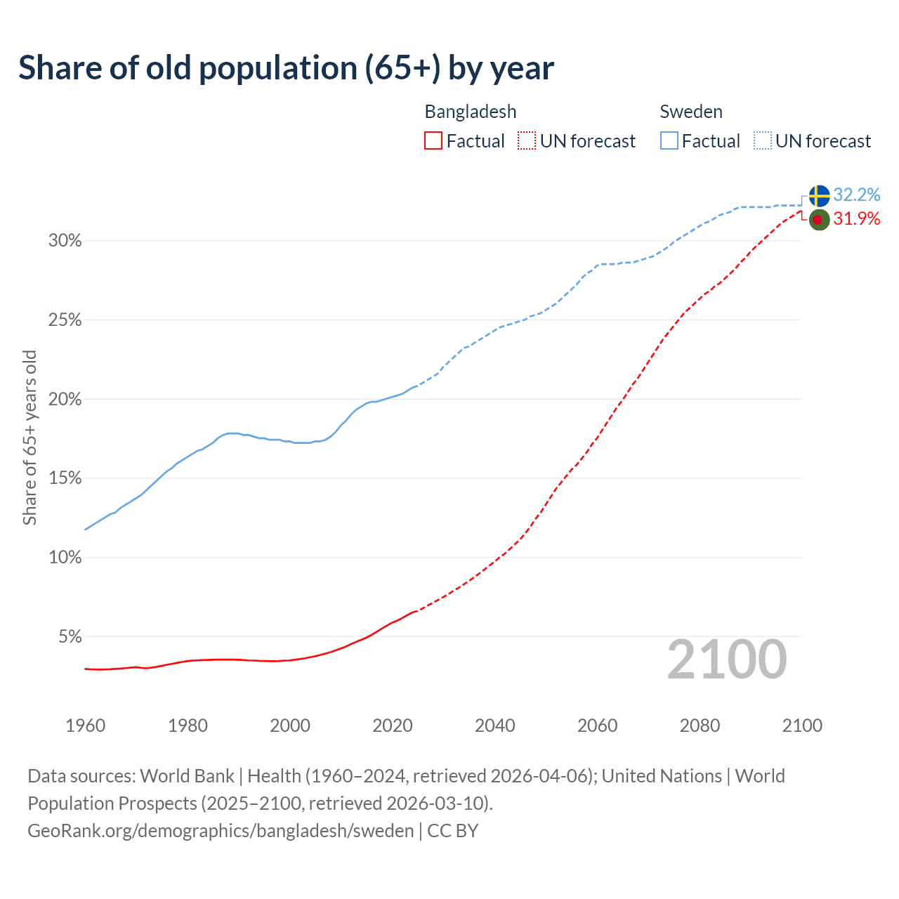 The share of older people aged 65 and over is 6.5% in Bangladesh and 20.7% in Sweden. Life expectancy in Bangladesh compared to Sweden .