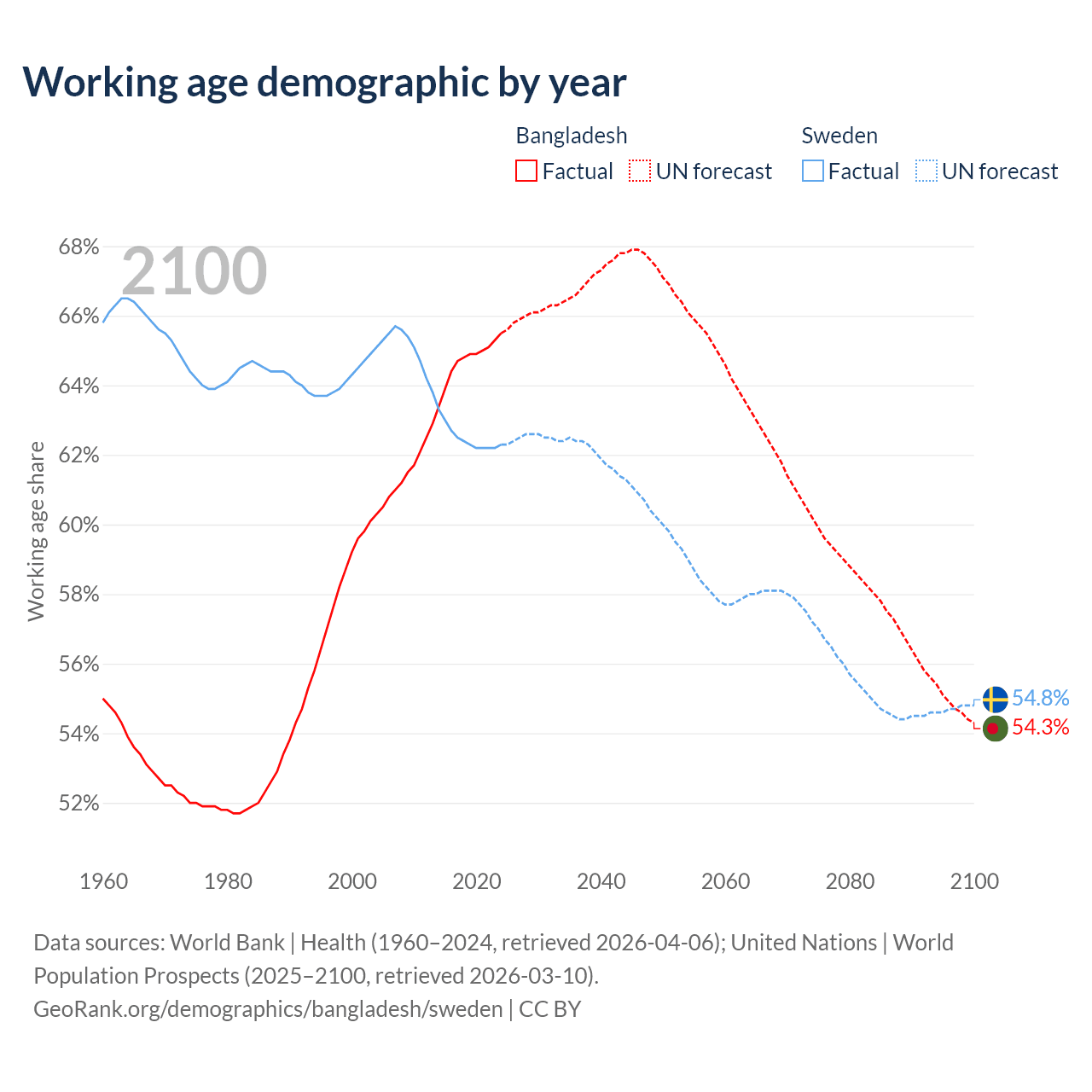 Median age Bangladesh vs Sweden, 1960-2100