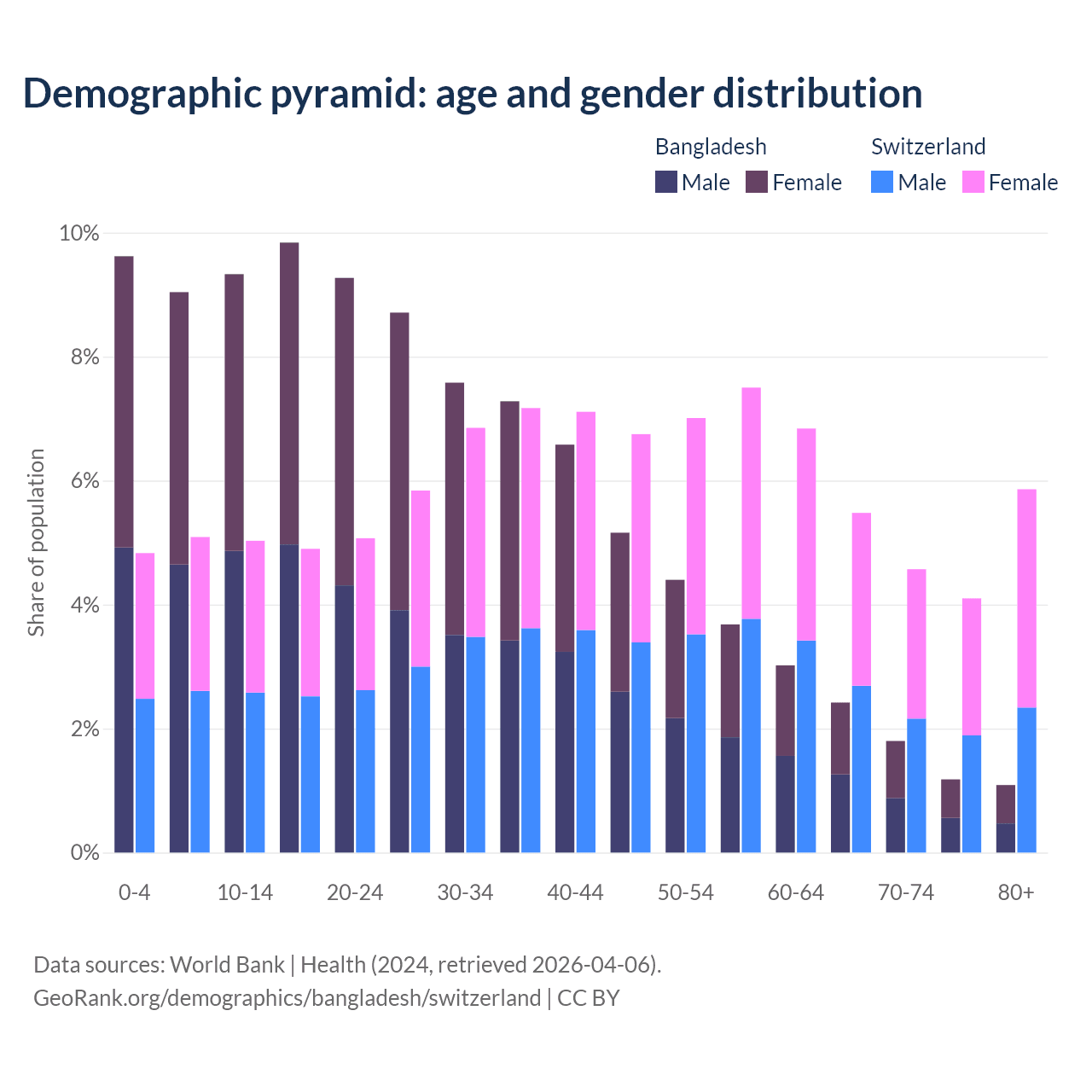 - Bangladesh is ranked 124/196 by median age (oldest to youngest) vs 24/196 for Switzerland.