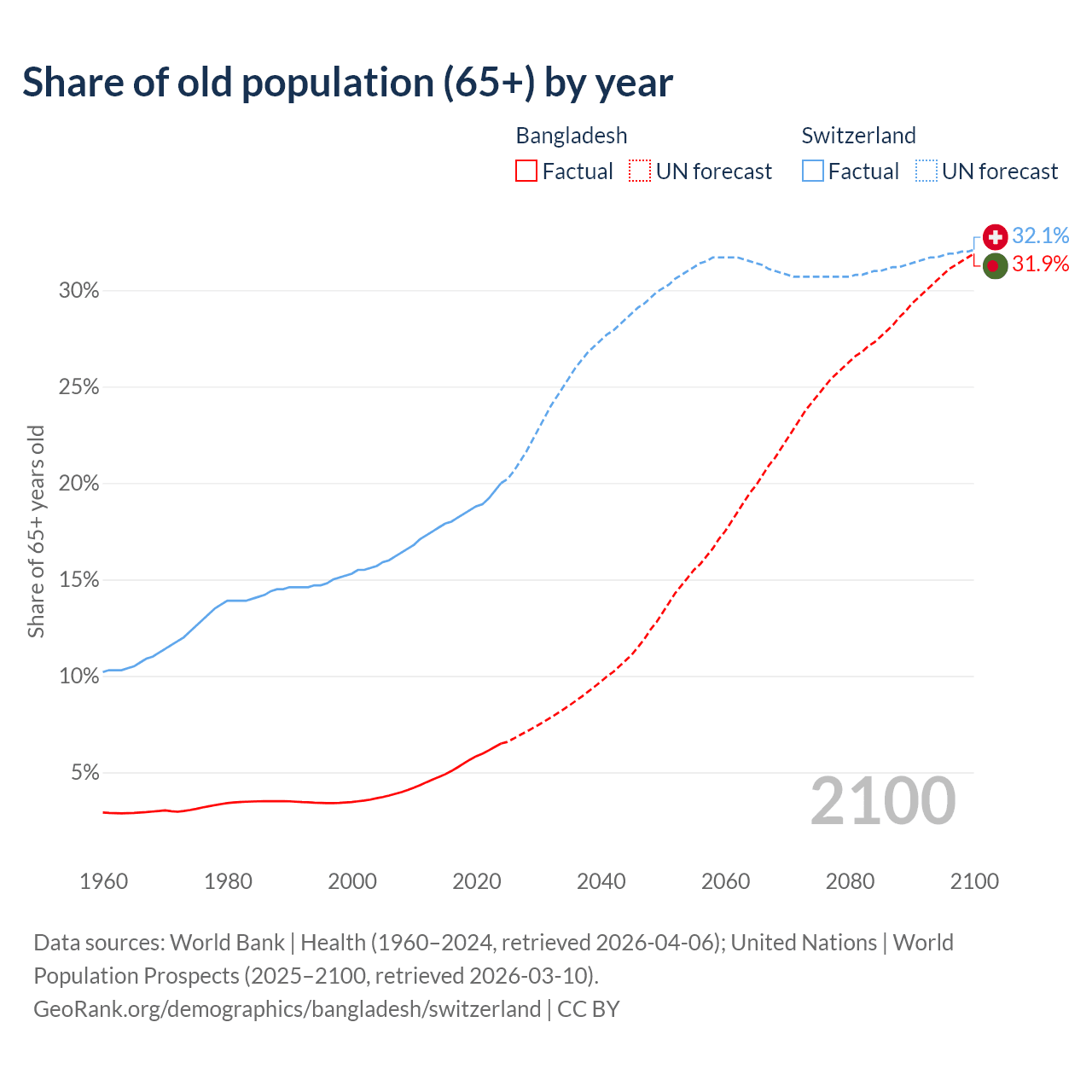 The share of older people aged 65 and over is 6.5% in Bangladesh and 20% in Switzerland. Life expectancy in Bangladesh compared to Switzerland .