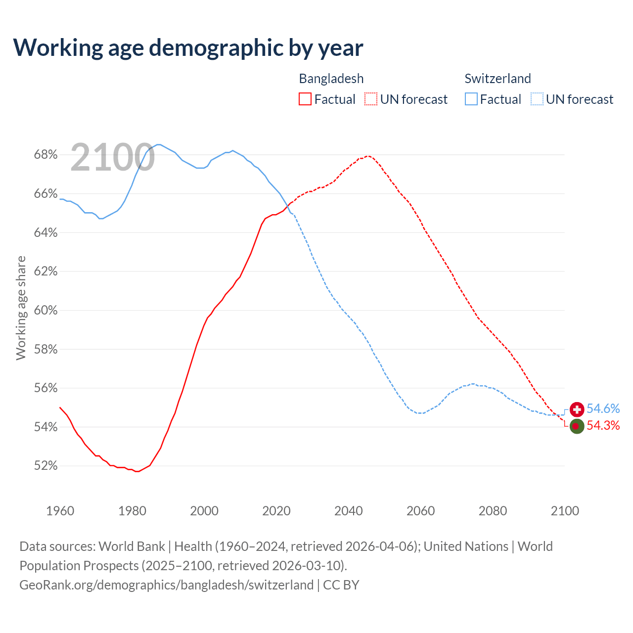 Median age Bangladesh vs Switzerland, 1960-2100