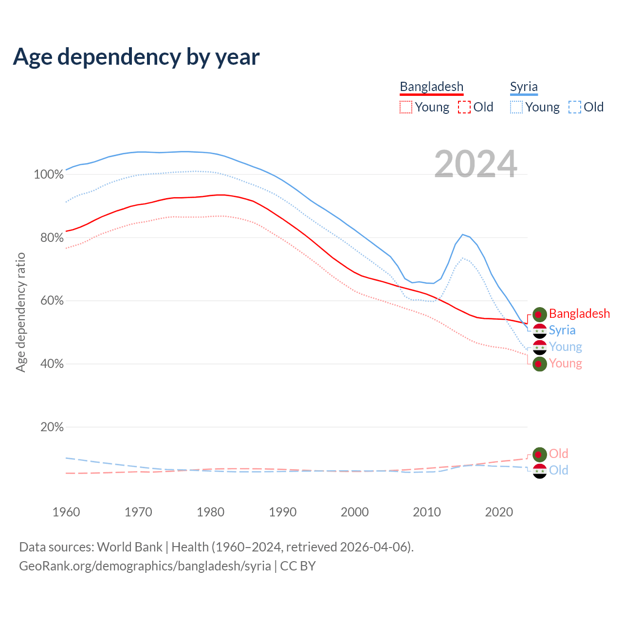 - The share of old-age demographic (65+) in Bangladesh is 6.5% vs 4.74% in Syria.