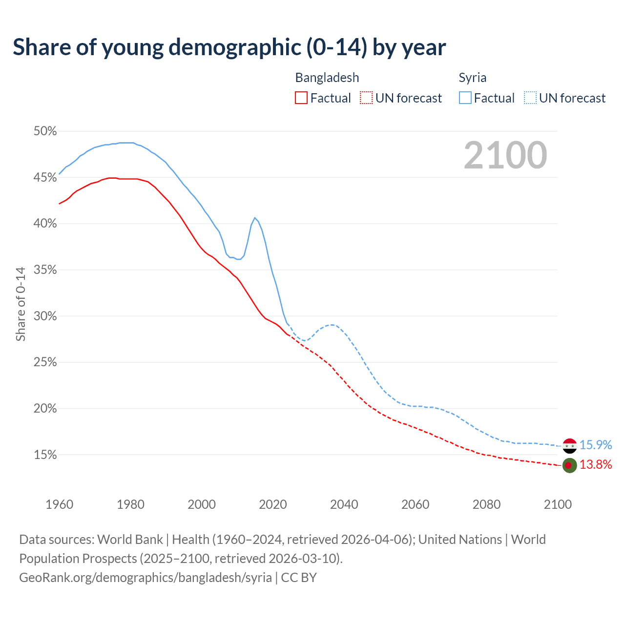- The share of young demographic (0-15 years old) in Bangladesh is 28% vs 29.2% in Syria.