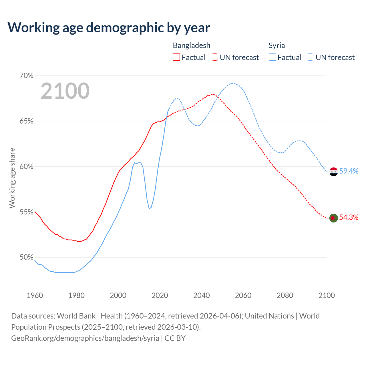 Median age Bangladesh vs Syria, 1960-2100