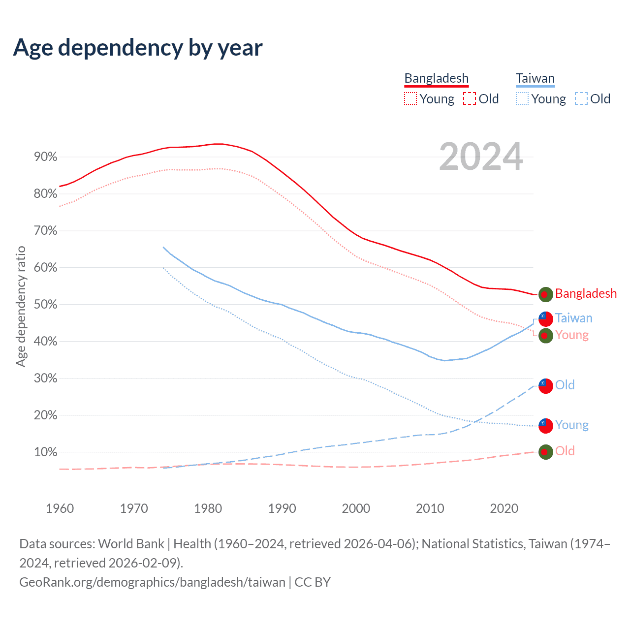 Data sources: World Bank | Health (1960–2024, retrieved 2026-04-06); U.S. Census Bureau (1960–2024, retrieved 2026-02-08); National Statistics, Taiwan (1974–2024, retrieved 2026-02-09).