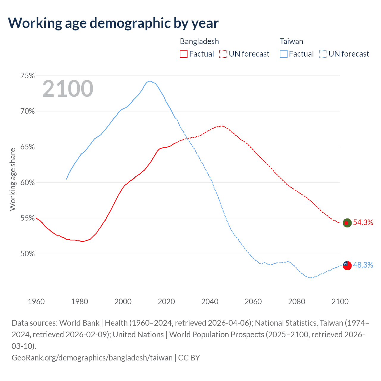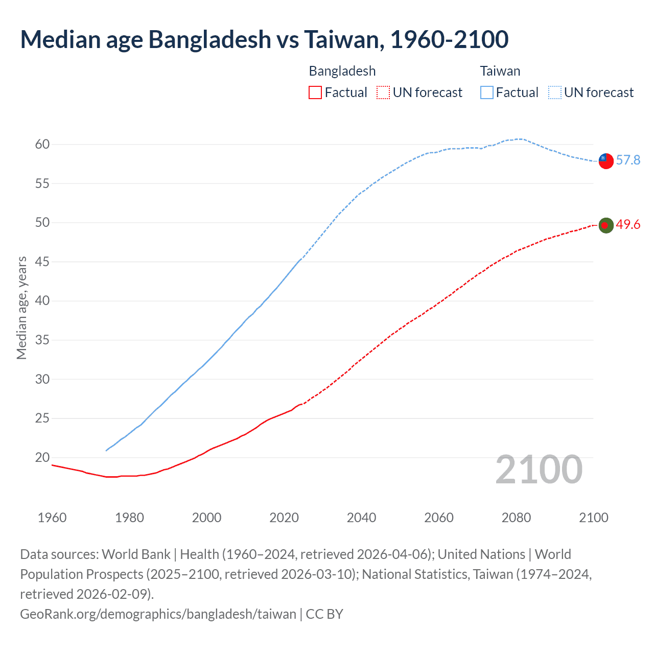 Median age Bangladesh vs Taiwan, 1960-2100