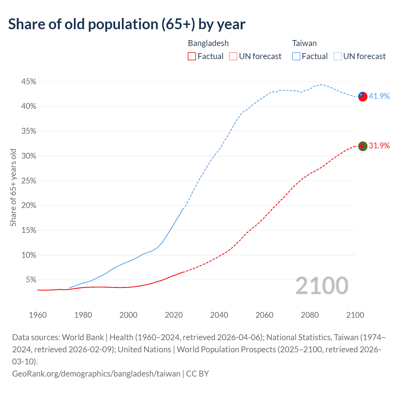 The share of older people aged 65 and over is 6.5% in Bangladesh and 19.2% in Taiwan. Life expectancy in Bangladesh compared to Taiwan .