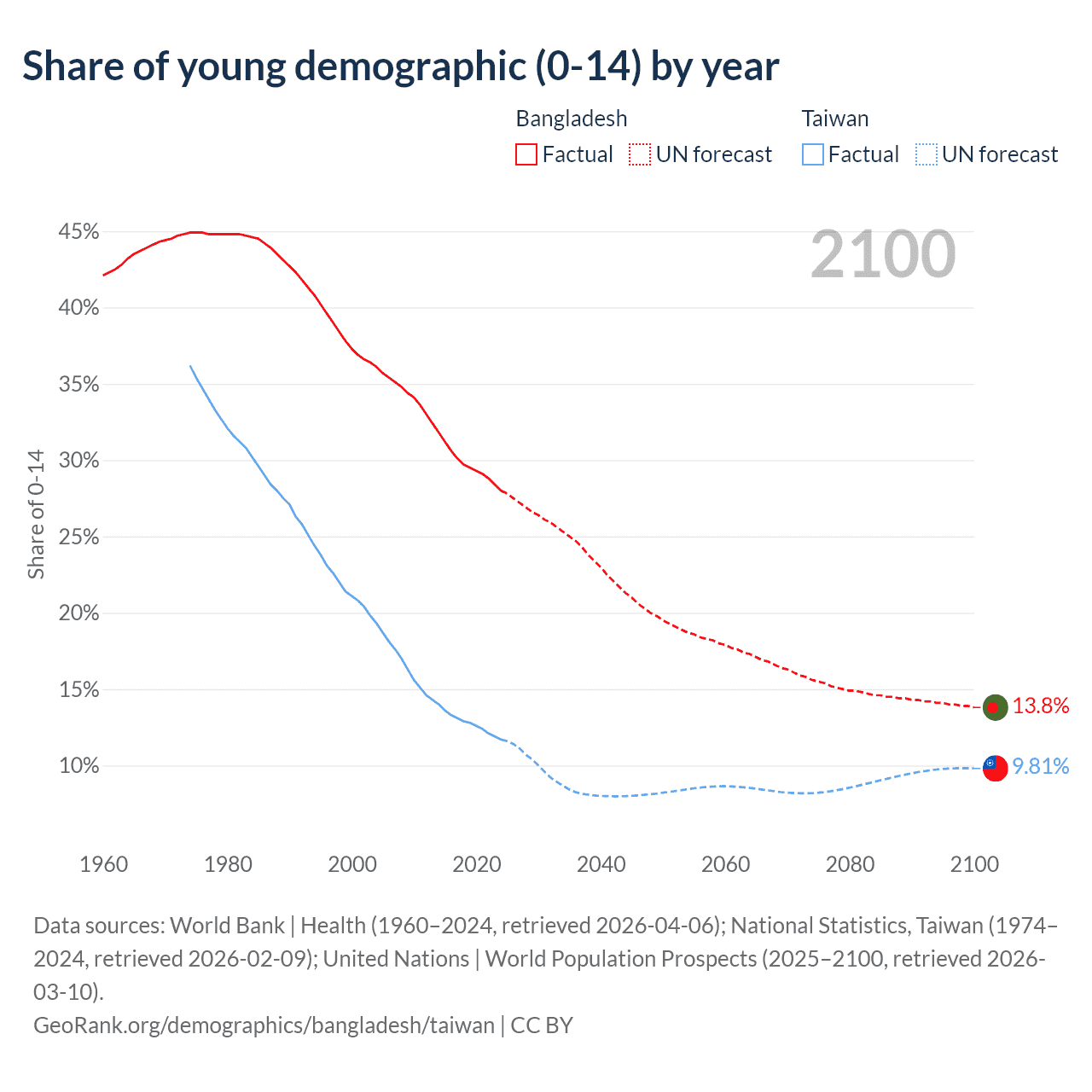 - The share of young demographic (0-15 years old) in Bangladesh is 28% vs 11.7% in Taiwan.