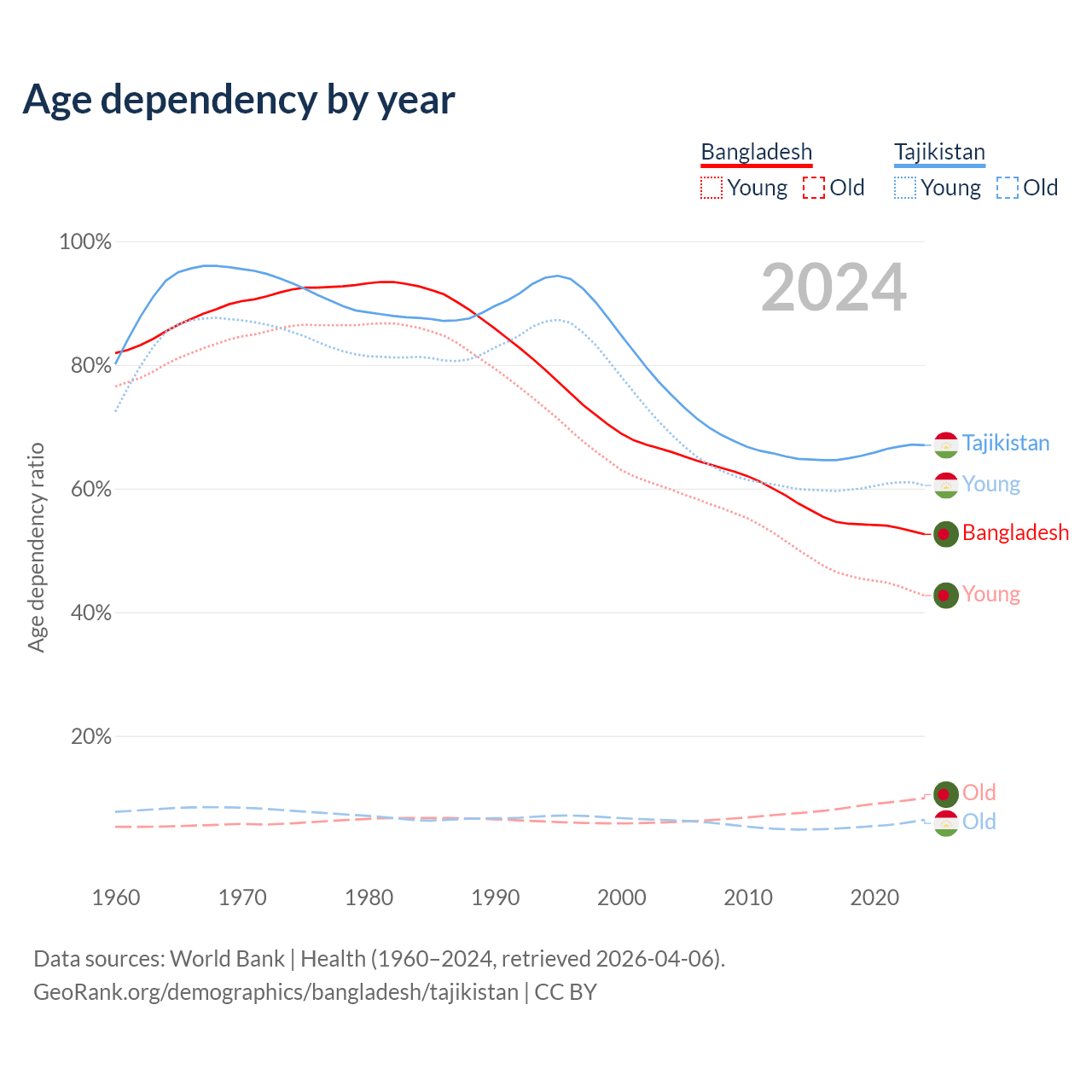 - Bangladesh is ranked 124/196 by median age (oldest to youngest) vs 142/196 for Tajikistan.