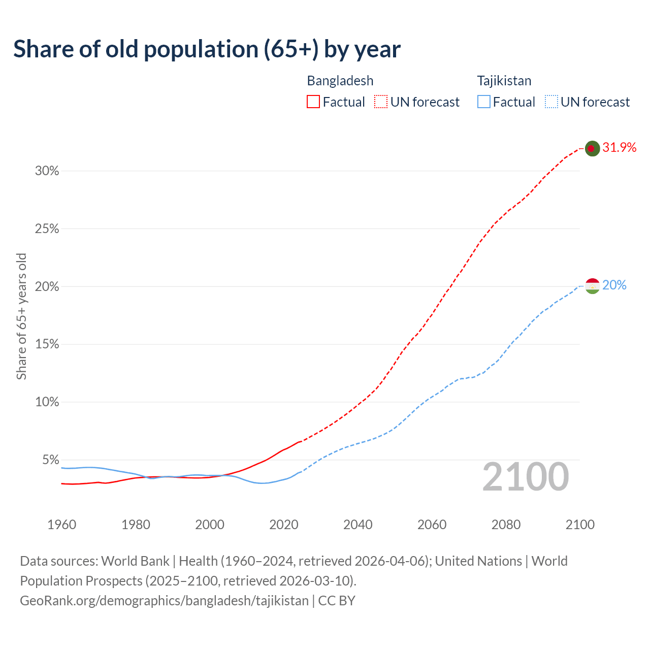 - The share of old-age demographic (65+) in Bangladesh is 6.5% vs 3.85% in Tajikistan.