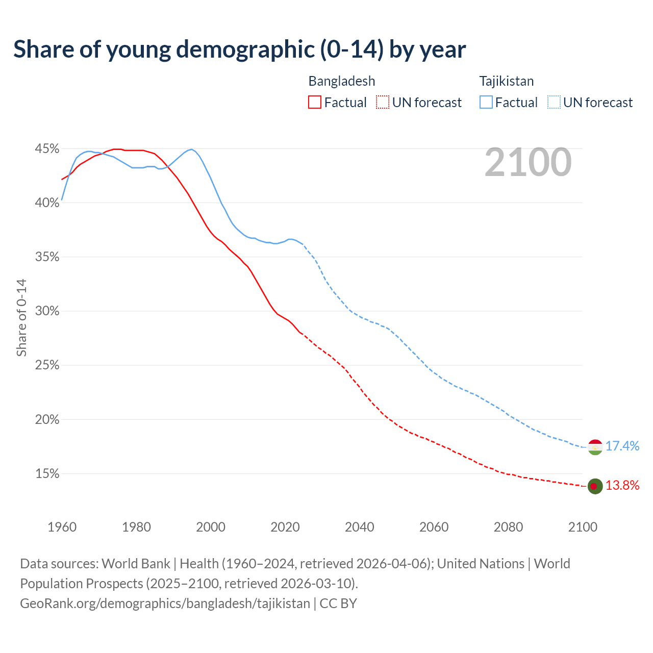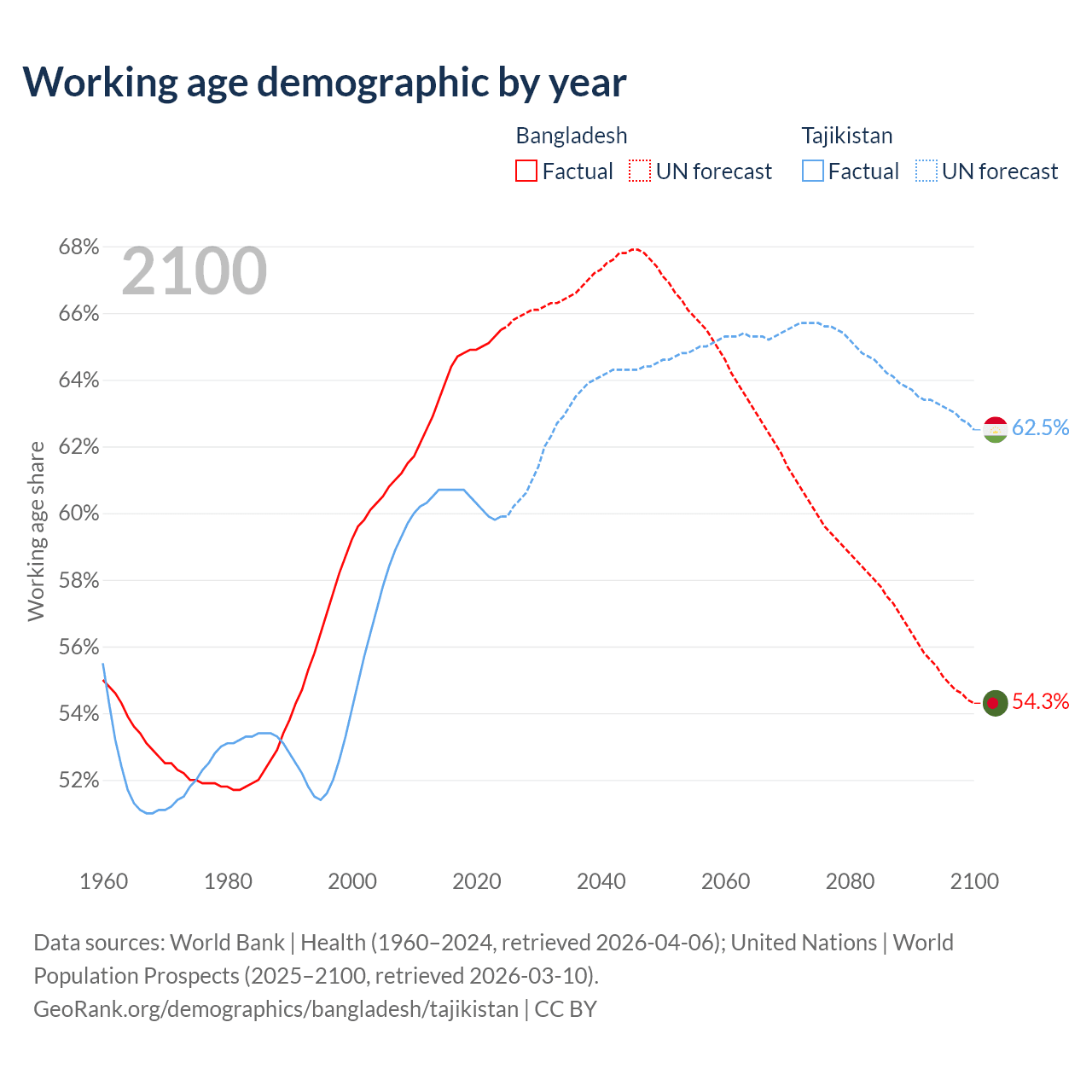 Median age Bangladesh vs Tajikistan, 1960-2100