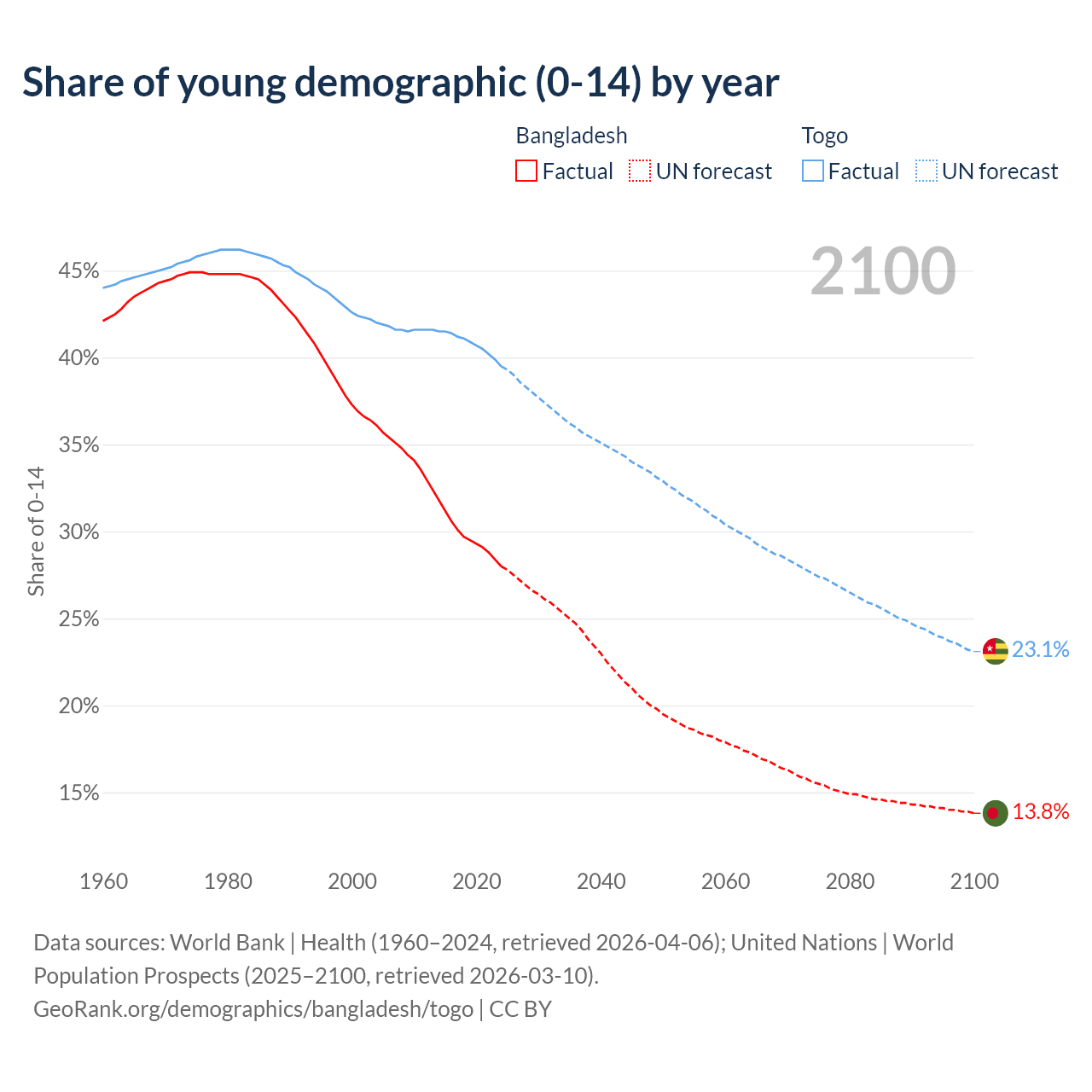 - The share of young demographic (0-15 years old) in Bangladesh is 28% vs 39.5% in Togo.