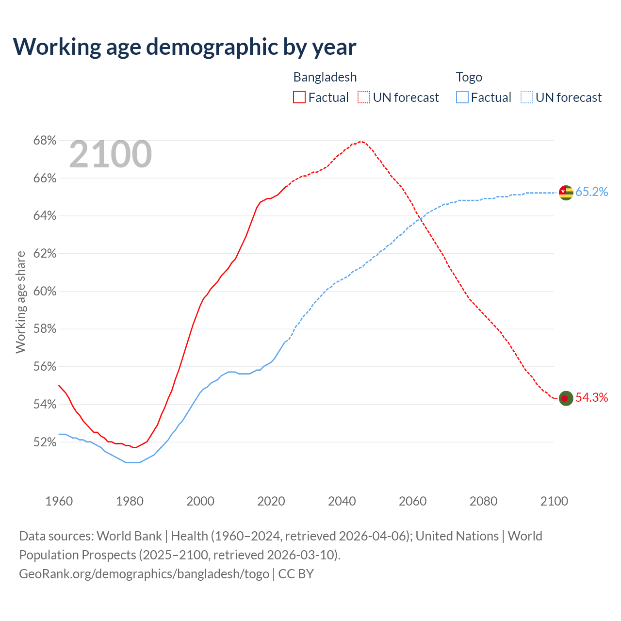 - Bangladesh has 117M working age adults (aged 15-64) vs 5.72M in Togo.